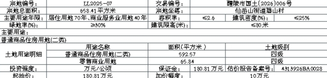 LL2025-07:(一)竞得者应在成交确认书签订之日起10个工作日内签订出让合同。(二)土地成交价款由竞得者在出让合同签订之日起一个月内缴纳出让金的50%,半年内缴清余款,逾期未缴部分,根据相关规定,征收违约金。(三)由醴陵市土地储备中心按现状条件交地,并承担因交地产生的相关法律责任。(四)须按醴陵市自然资源局出具的《醴陵市仙岳山储备地一号补征A地块用地性质认定蓝线图及规划条件》实施。