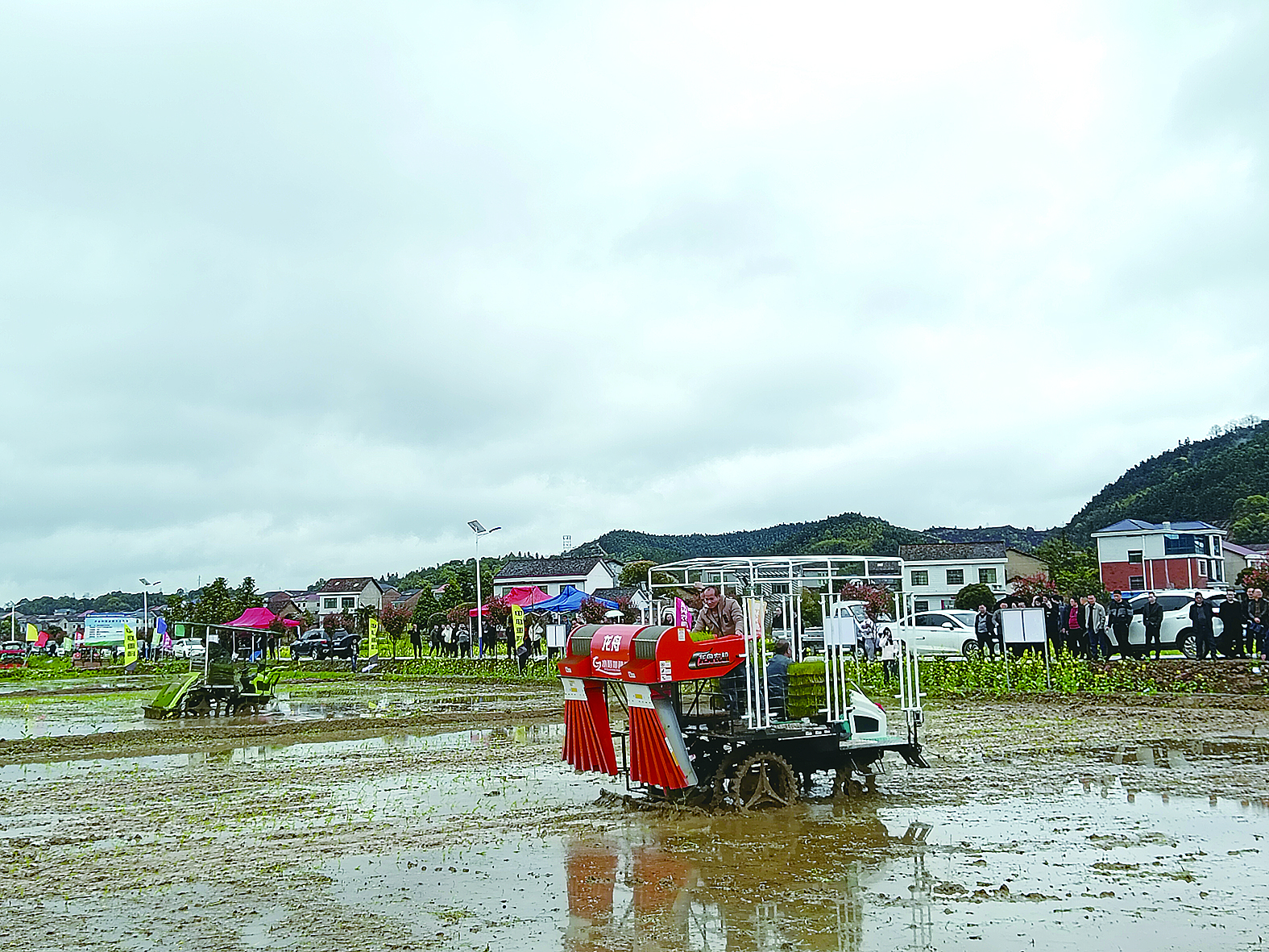 诸多农机合作社负责人和种粮大户现场观摩抛秧机与插秧机同台竞技。 记者/侯德怀 摄