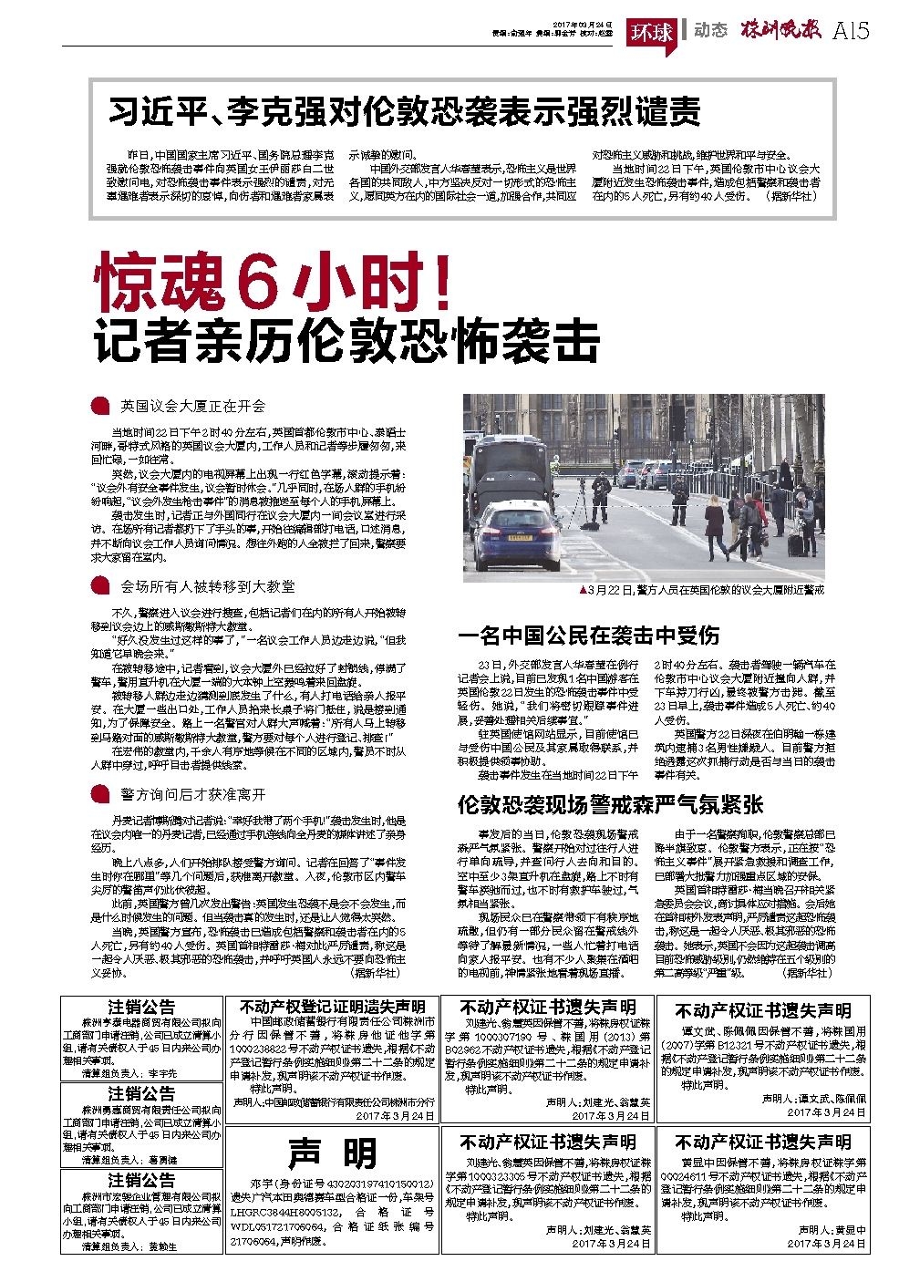 习近平、李克强对伦敦恐袭表示强烈谴责
