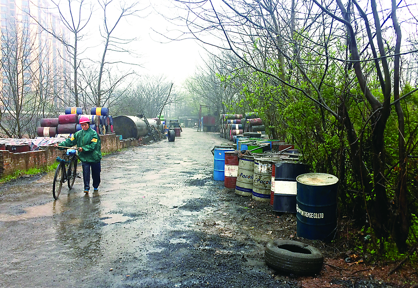 ▲3月5日,红港路附近的这处空地上堆了不少油桶 记者 谢慧 摄