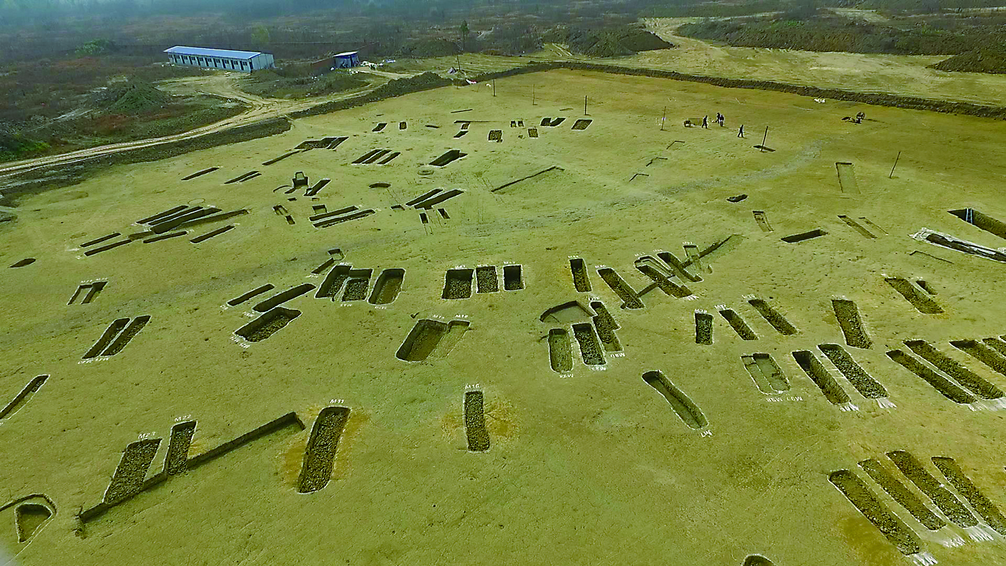 记者在现场看到,发掘现场足有两个足球场大,密集分布着大小不一的长方形竖穴土坑墓。