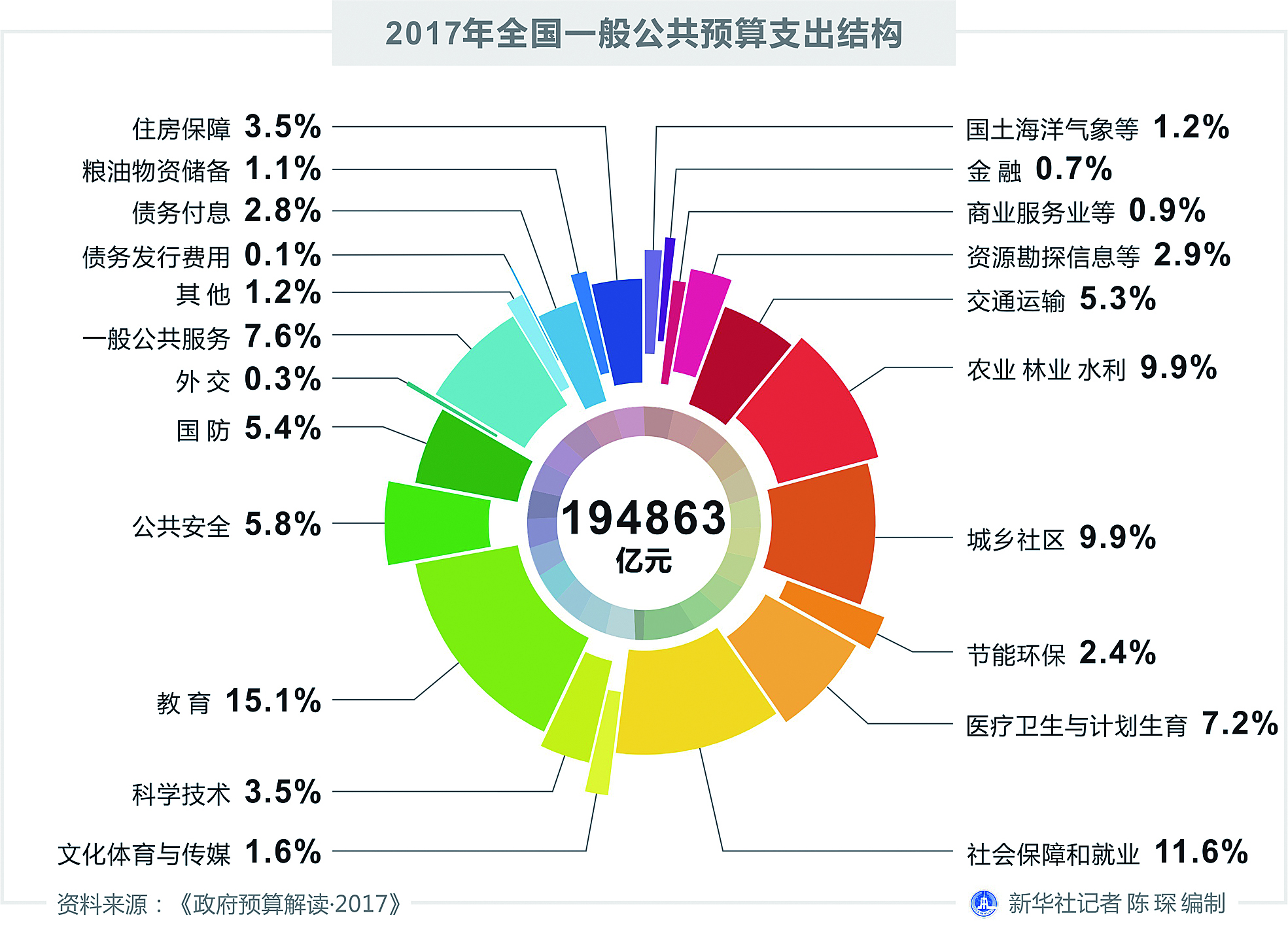 017年全国财政支出占比,教育、社保、医卫成“前三甲”