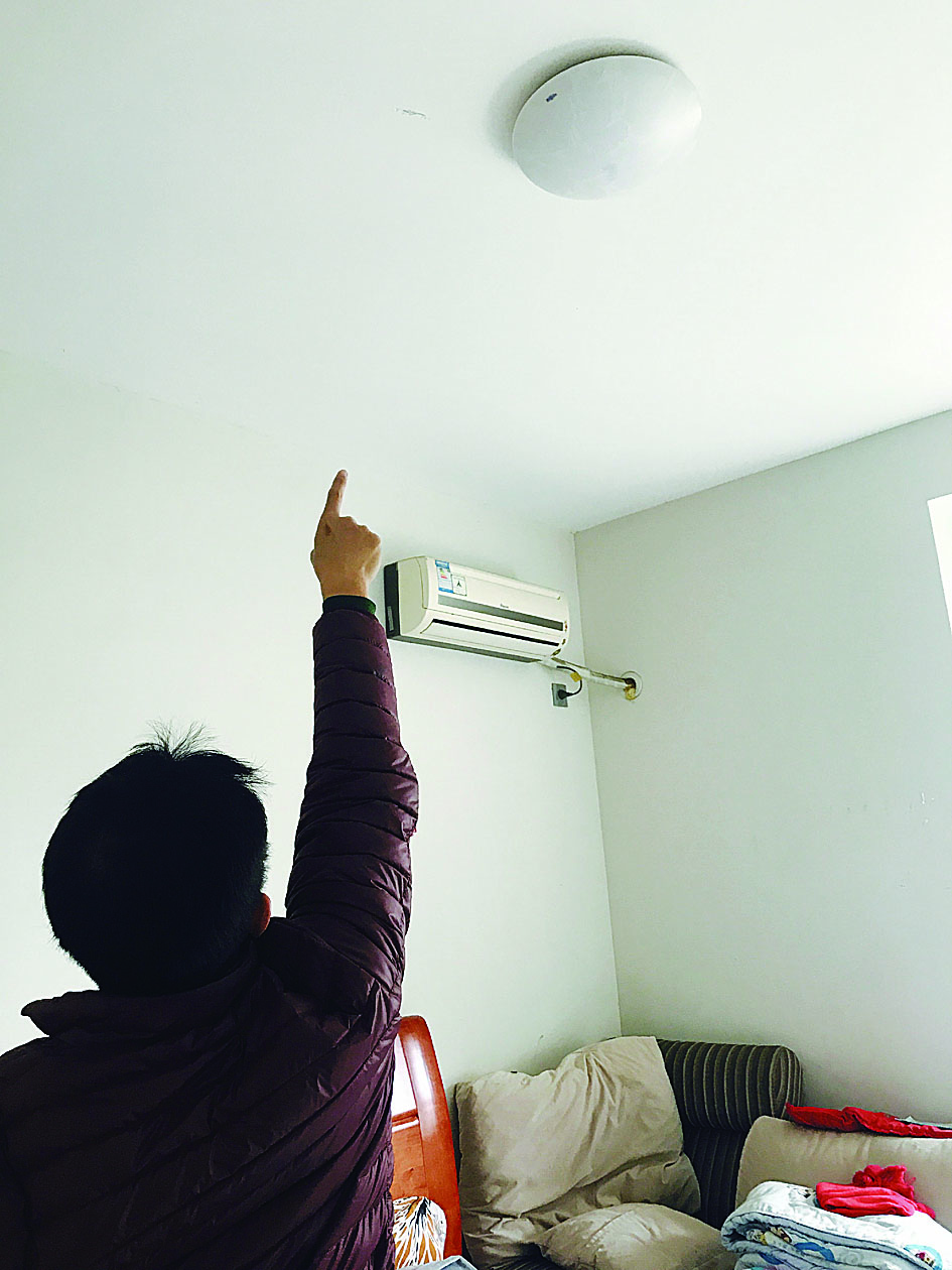 ▲何先生指着吸顶灯旁边的裂缝 记者 王娜 摄