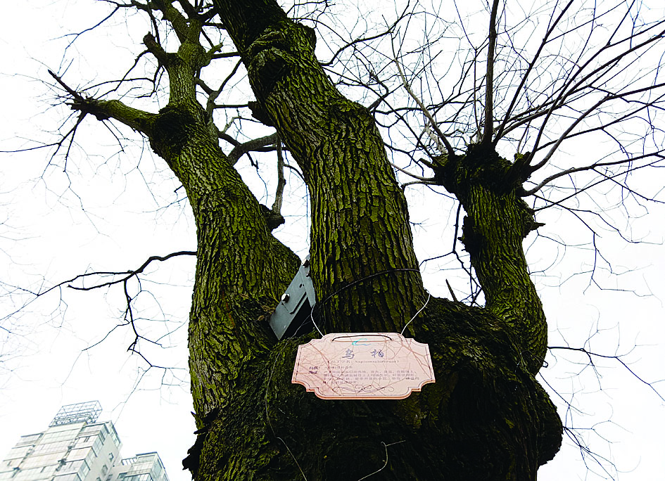 ▲一棵乌桕树的树牌显示为乌柏 记者 谢慧 摄