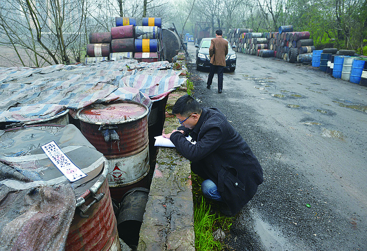 ▲3月7日,新塘坡村,环保执法人员正在查封废旧油桶