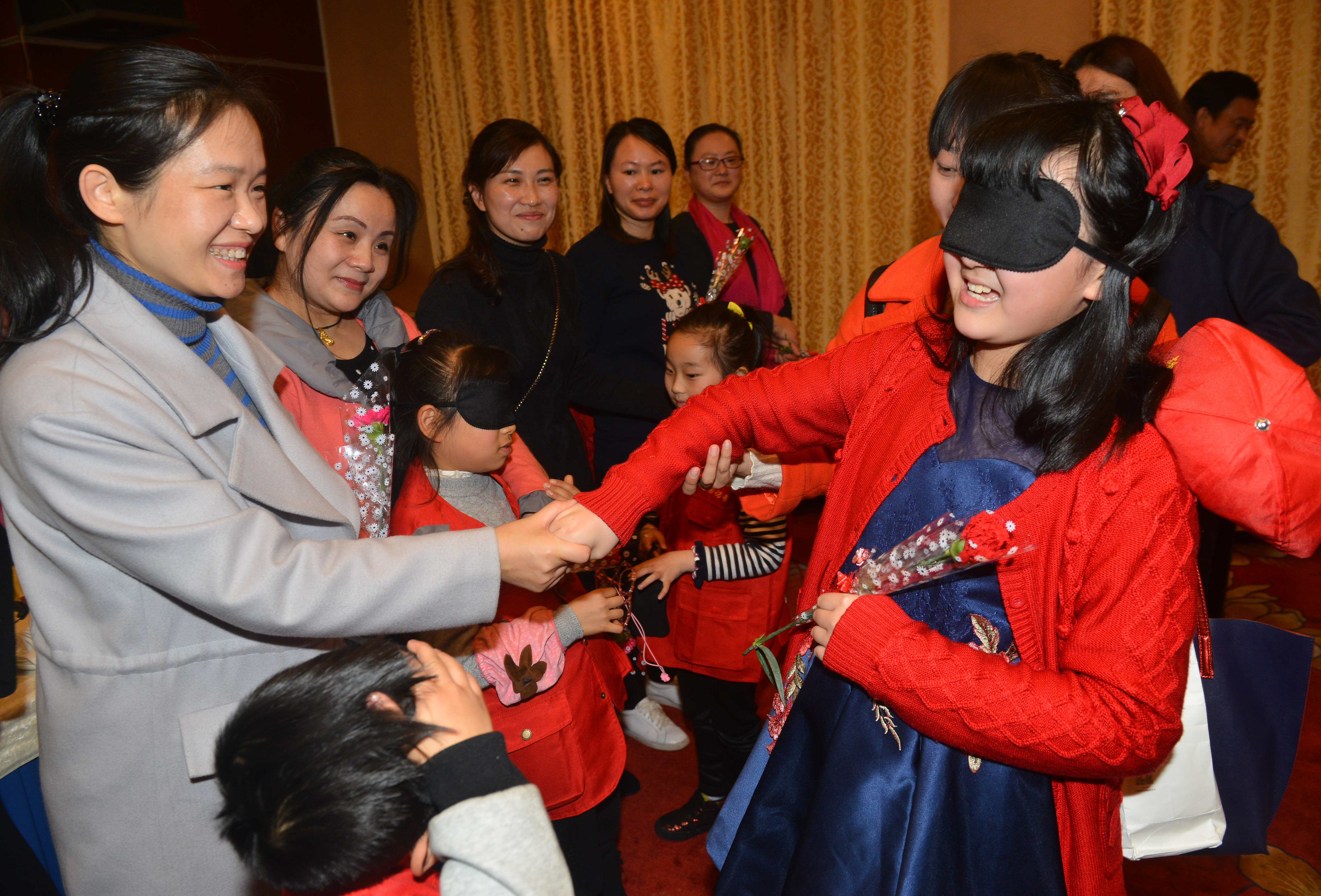在“心有灵犀”活动环节,小记者们分别从酒店方领取了一朵康乃馨,然后将自己的眼睛蒙上,通过抚摸双手的方式寻找自己的妈妈。游戏中,很多孩子都第一时间找准了自己的妈妈,并来了一个大大的拥抱。