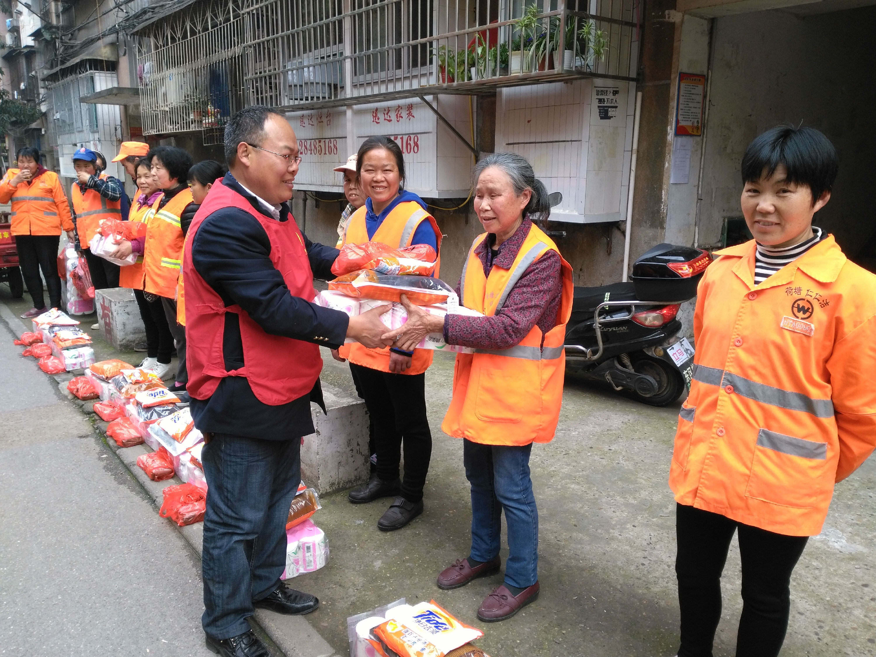 昨日,晚报义工唐先华组织爱心志愿者,慰问荷塘区上月塘社区、新月塘社区、钻石路社区、前进社区的女性环卫工人,为她们送去食用油、保暖裤、面条等物资。