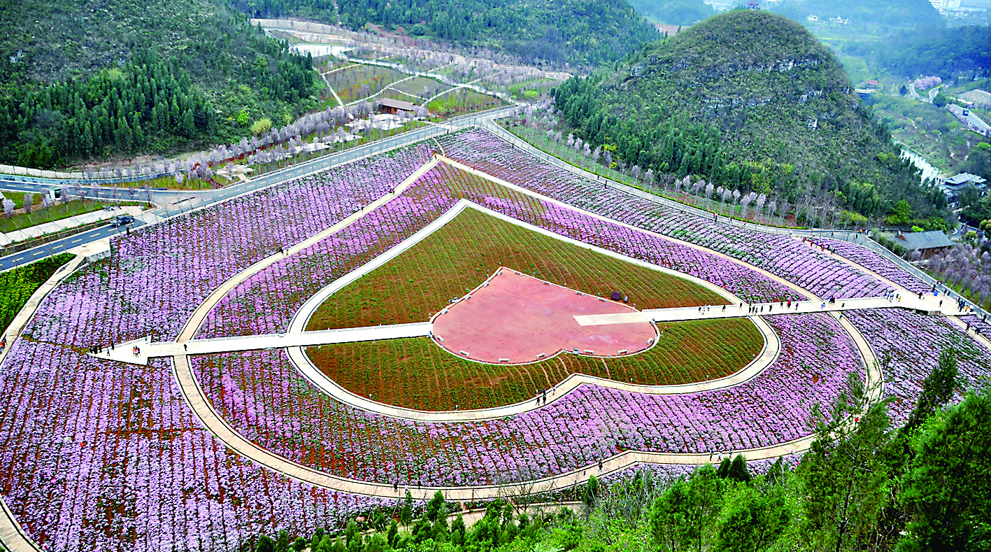 近日,贵州兴义贵州醇风景区的各色花卉竞相绽放,丘比特广场心形花海景观成为人们享受春光的好去处。