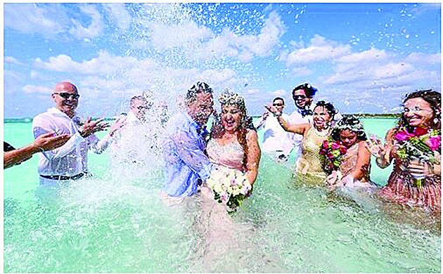 近日,一对美国夫妻在墨西哥加勒比地区科苏美尔岛附近的浅水海域举行了一场梦幻浪漫的水中婚礼。两人在水下交换戒指、甜蜜亲吻,一旁的宾客也都站在水中围观、送上祝福。
