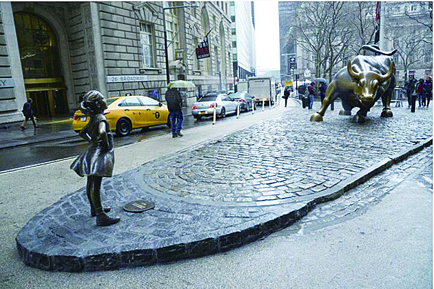 国际妇女节前夕,美国纽约华尔街牛气冲天的铜牛雕像面前出现了一个勇敢女孩雕像。她与巨牛相对而立,叉腰对视毫无惧色。《纽约每日新闻》称,妇女节前夕树立此雕像的目的是呼吁人们重视华尔街中女性的地位。