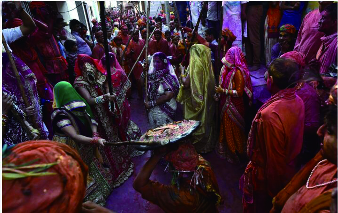 当地时间2017年3月7日,印度Nandgaon,当地民众庆祝“棒打男人节”。“棒打男人节”是胡里节的一部分,妇女身穿彩服头裹纱巾,拿着竹竿打男人。