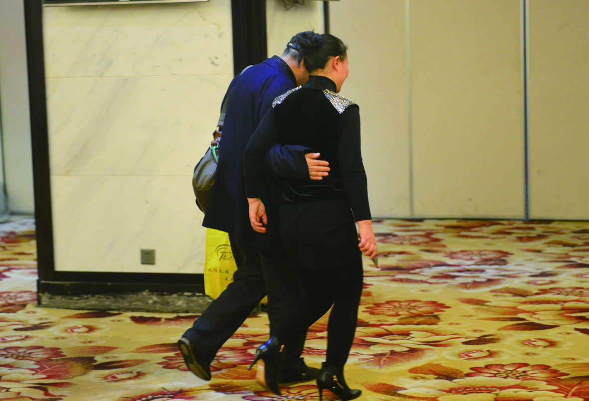 ▲3月10日,散会后,现场的一位女性工作人员与一位老人向会场外走去 记者 谢慧 摄