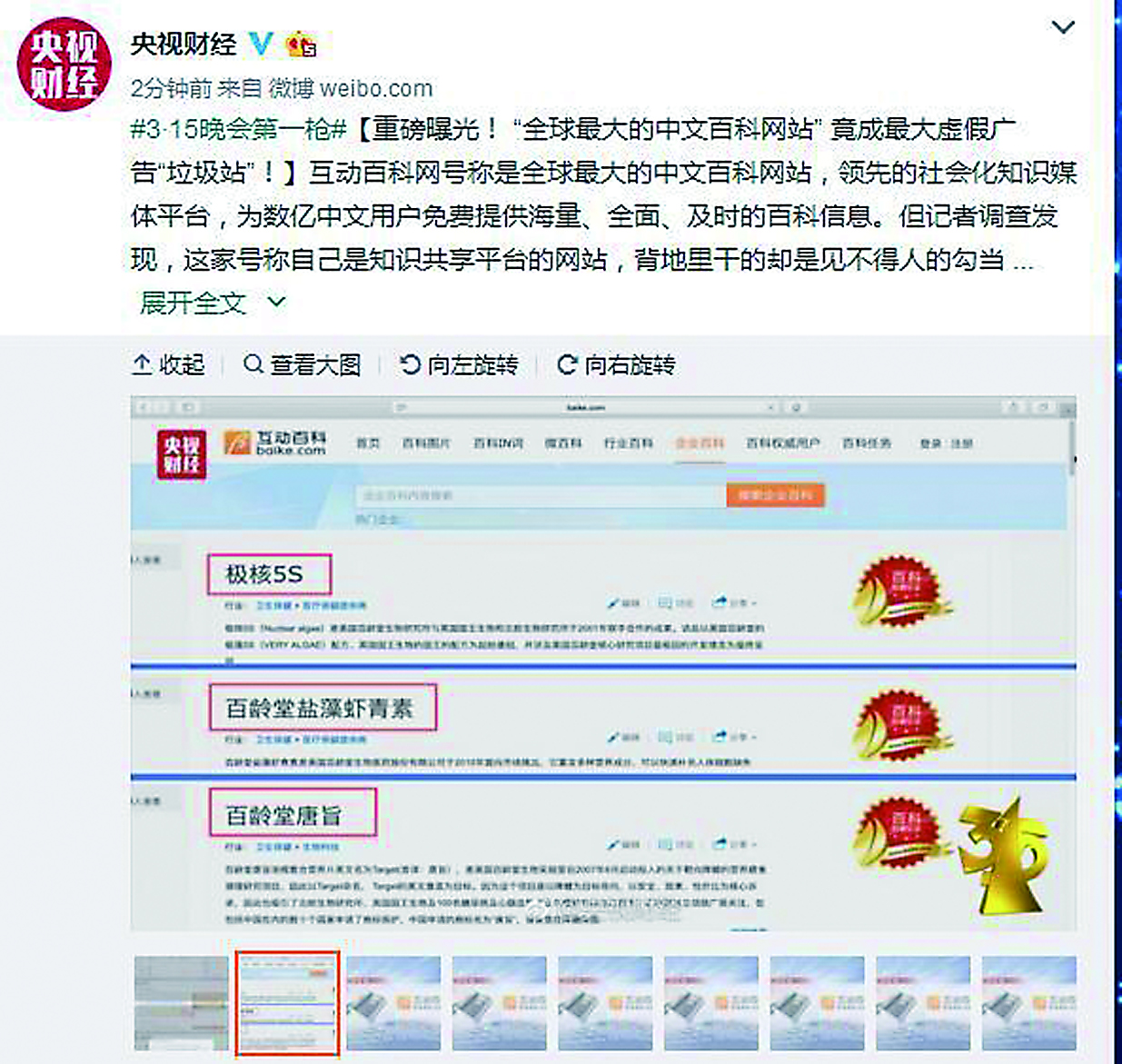 在这里,一些号称神奇的产品,光鲜的人物简历,只要花4800元钱就可以开通 “百科词条认领”的服务,然后就可以随意杜撰并发布,用虚假的广告堂而皇之地圈钱。比如说,有一个词条名叫“极藻5s”,号称一位肝癌患者服用“极藻5s”仅仅7天,癌细胞就不见了,该产品一经发布月售上万盒,但如此神奇的产品,在国家食品药品监督管理总局网站上却查不到任何相关信息。而一位号称获取“国家医学进步奖”的中医,其实就在陕西渠子村的一家小诊所,而且没有行医资质…别忘了,网络经济所催生的不仅是金钱,还有一份沉甸甸的社会责任。