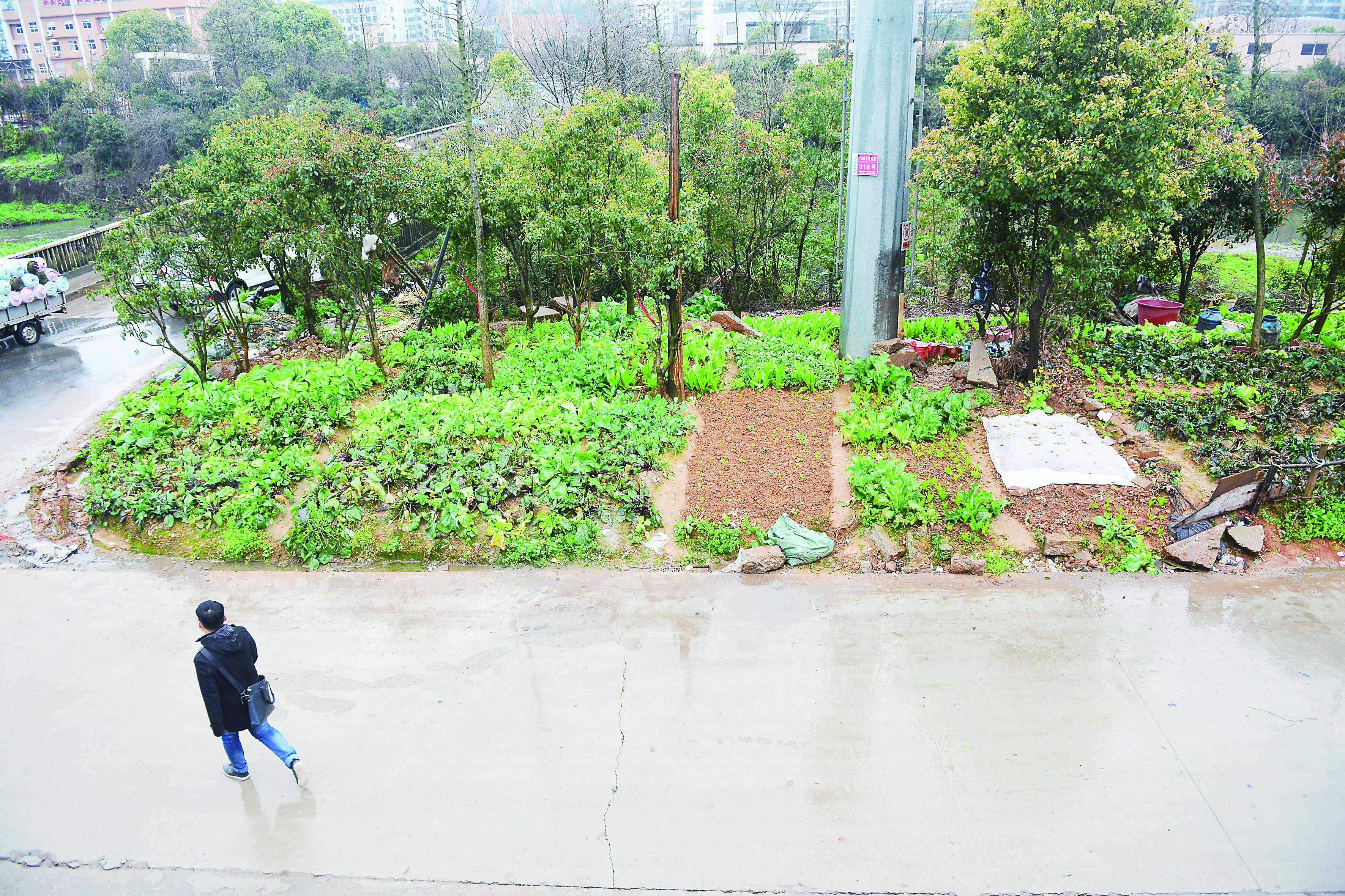 ▲3月15日,石宋路高架桥下,马路边的绿化带上种满了蔬菜 记者 谢慧 摄