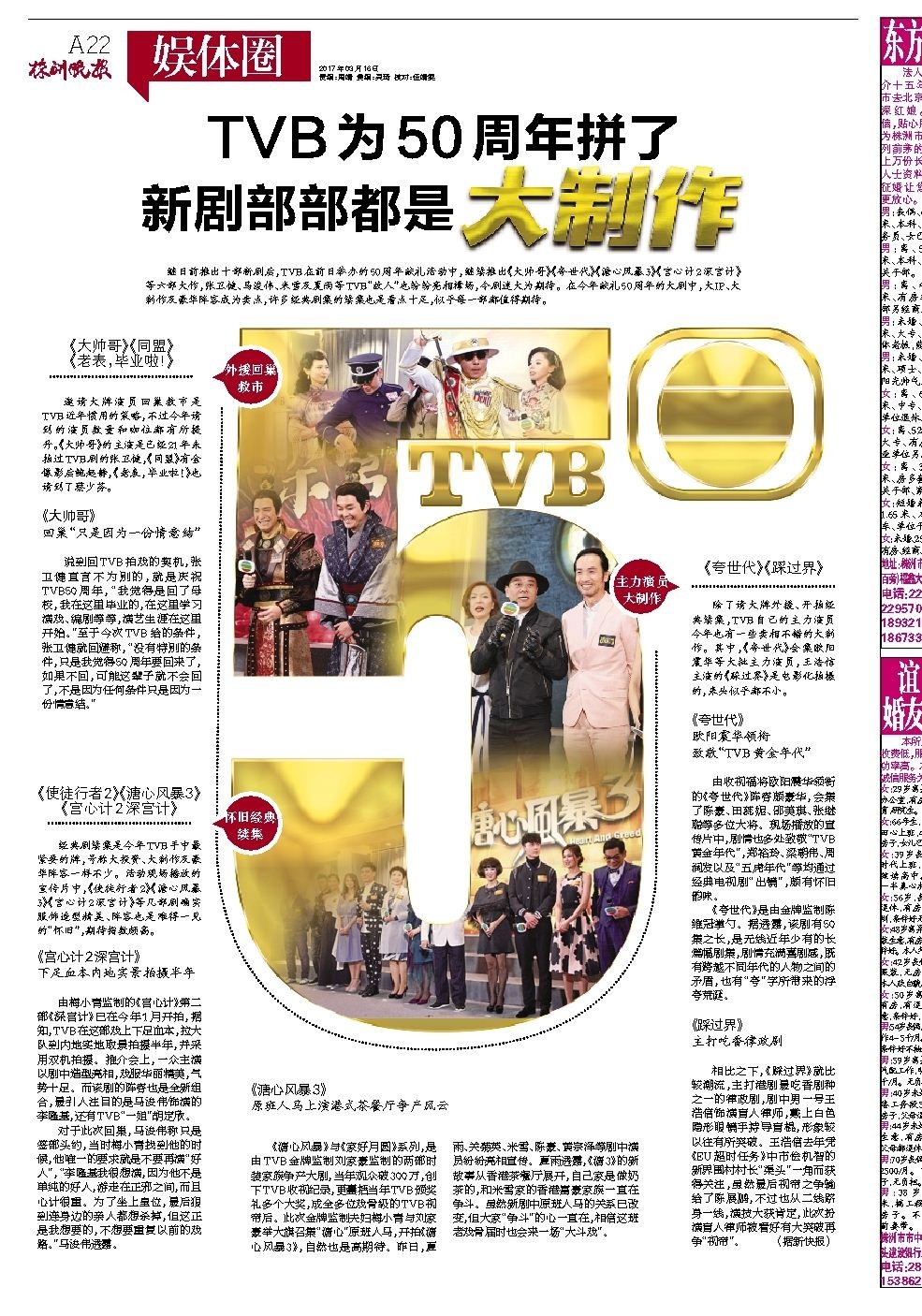 继日前推出十部新剧后,TVB在前日举办的50周年献礼活动中,继续推出《大帅哥》《夸世代》《溏心风暴3》《宫心计2深宫计》等六部大作,张卫健、马浚伟、米雪及夏雨等TVB“故人”也纷纷亮相撑场,令剧迷大为期待。在今年献礼50周年的大剧中,大IP、大制作及豪华阵容成为卖点,许多经典剧集的续集也是看点十足,似乎每一部都值得期待。