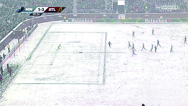 近日,美国职业大联盟第三轮开战,明尼苏达联队主场1-6惨败亚特兰大联队。本场比赛也创造了MLS历史纪录,在华氏20°(摄氏-6°)情况下开踢,成为美国大联盟历史上最寒冷的比赛。本场比赛由于受到暴雪影响采用了橙色用球,裁判在比赛中不断地因为天气状况暂停比赛,工作人员不得不用除雪剂来清理场地。