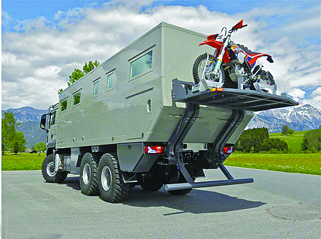 喷着军绿色的漆,重达18吨,装有一组巨大的轮子,这辆超大型野营车仿佛是从战场上开出来的一样。这辆车产于奥地利,拥有720马力的引擎,售价73万欧元(约为539万人民币)。尽管外形看上去像坦克,但这款车是一辆适合环球旅行的移动房车,内部居住面积超过23平方英尺,配备卫星电视、洗衣机、烘干机、冰箱、独立浴室、衣柜及双人床等,车后还有一个平台,可以停放摩托车。