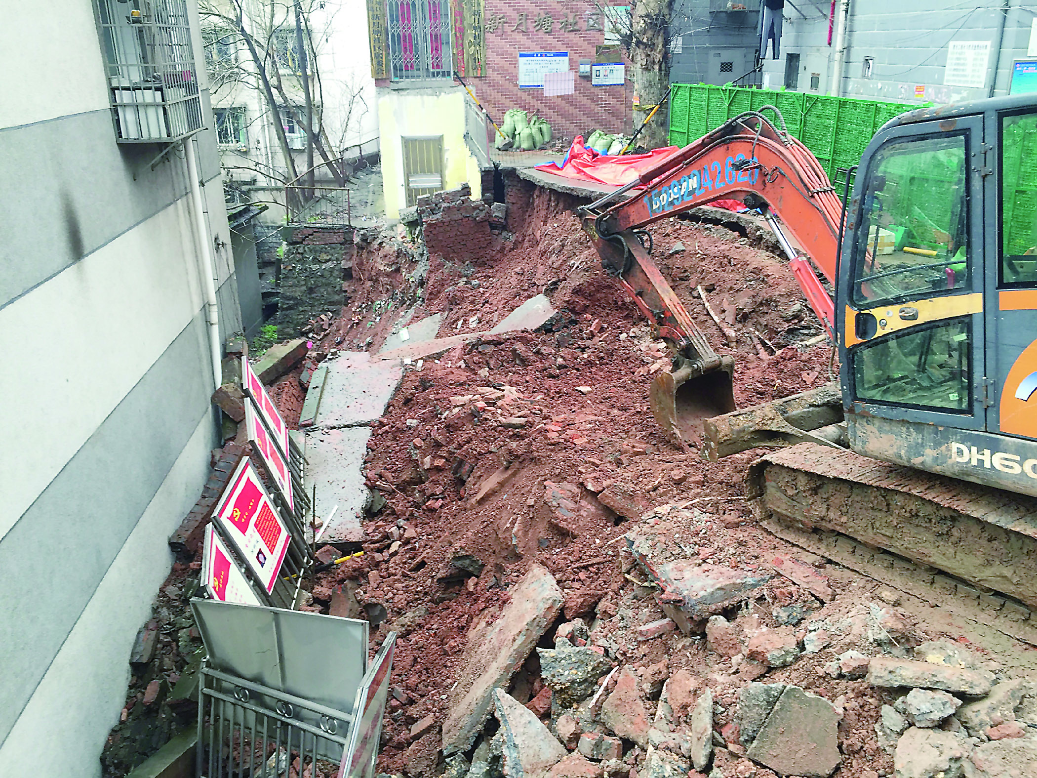 记者昨日来到现场看到,垮塌地点位于新月塘社区居委会前坪附近,离最近的一栋房屋不足1米,垂直落差约10米,部分落石已将护坡与楼栋间的狭窄空间堵塞。考虑到安全原因,居委会目前已经暂停办公,垮塌区域四周架起了警示牌并进行围挡,市政维护部门工作人员正在进行抢险。