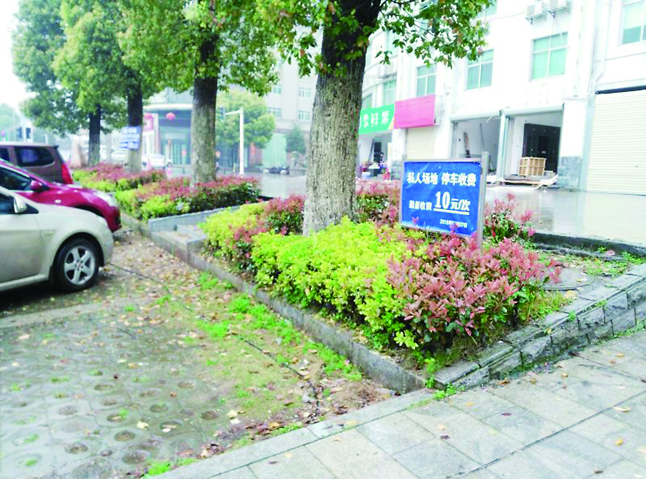 ▲人行道上设“停车场”,牌子上写着“收费10元/次”字样 受访者供图