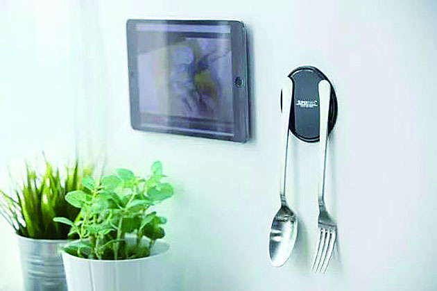 这个黑乎乎的小东西叫Fixate,看上去像个杯垫,不过科技含量相当高,它的表面覆盖了一层特殊纳米级材料,可以轻松吸附在任何平面上。只要你轻轻往墙上一扔,立马能粘得紧紧的,你可以放心将任何东西挂在上面,保证不会掉下来,无论是酒瓶、平板、钥匙等等都不成问题。要取下它来也很容易,顺着边缘撕下来即可。Fixate适用于任何表面,只要你想得到,在任何时候都可以有用武之地。