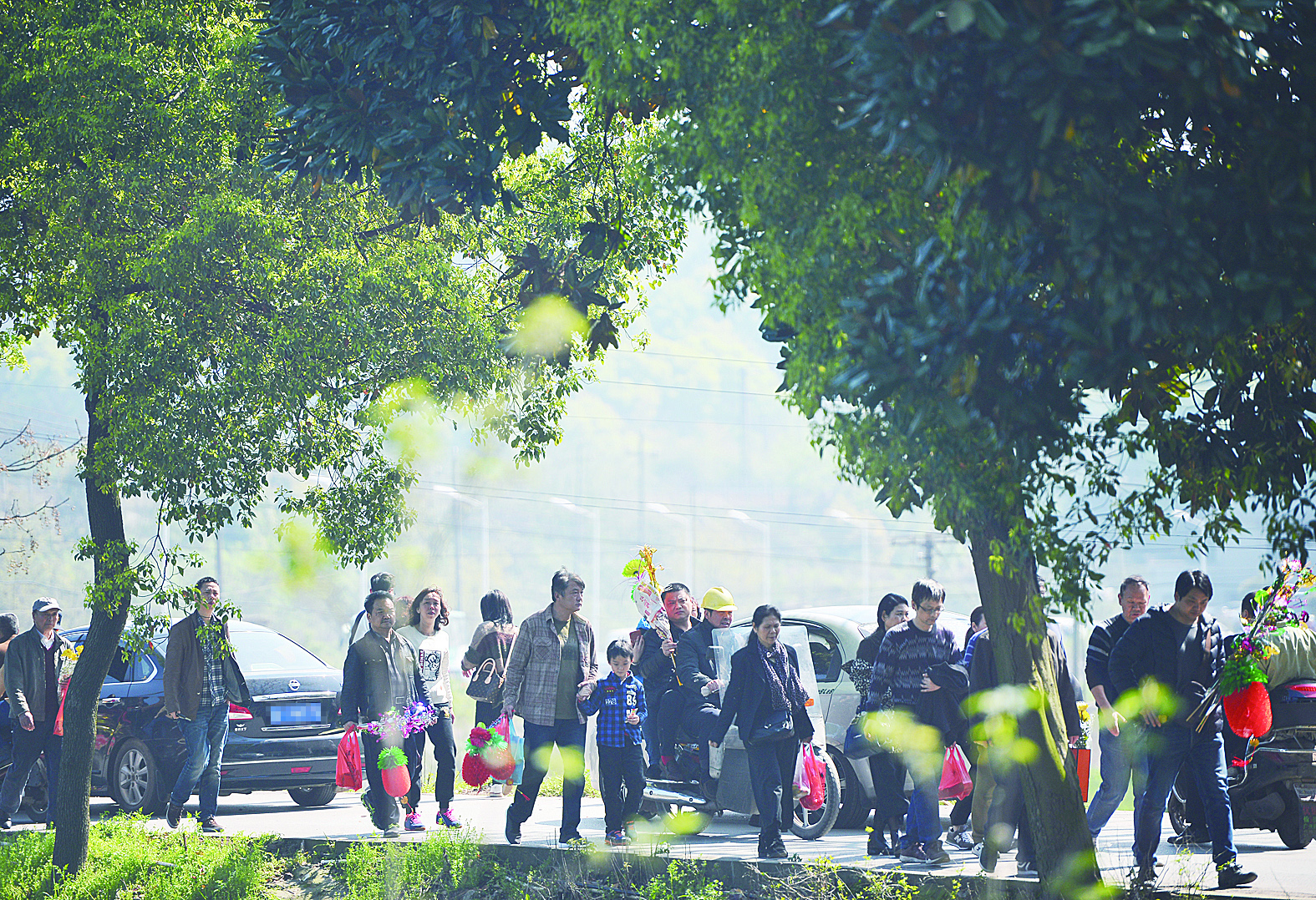 ▲4月2日,福寿山庄附近,有很多市民选择徒步去扫墓 记者 谢慧 摄