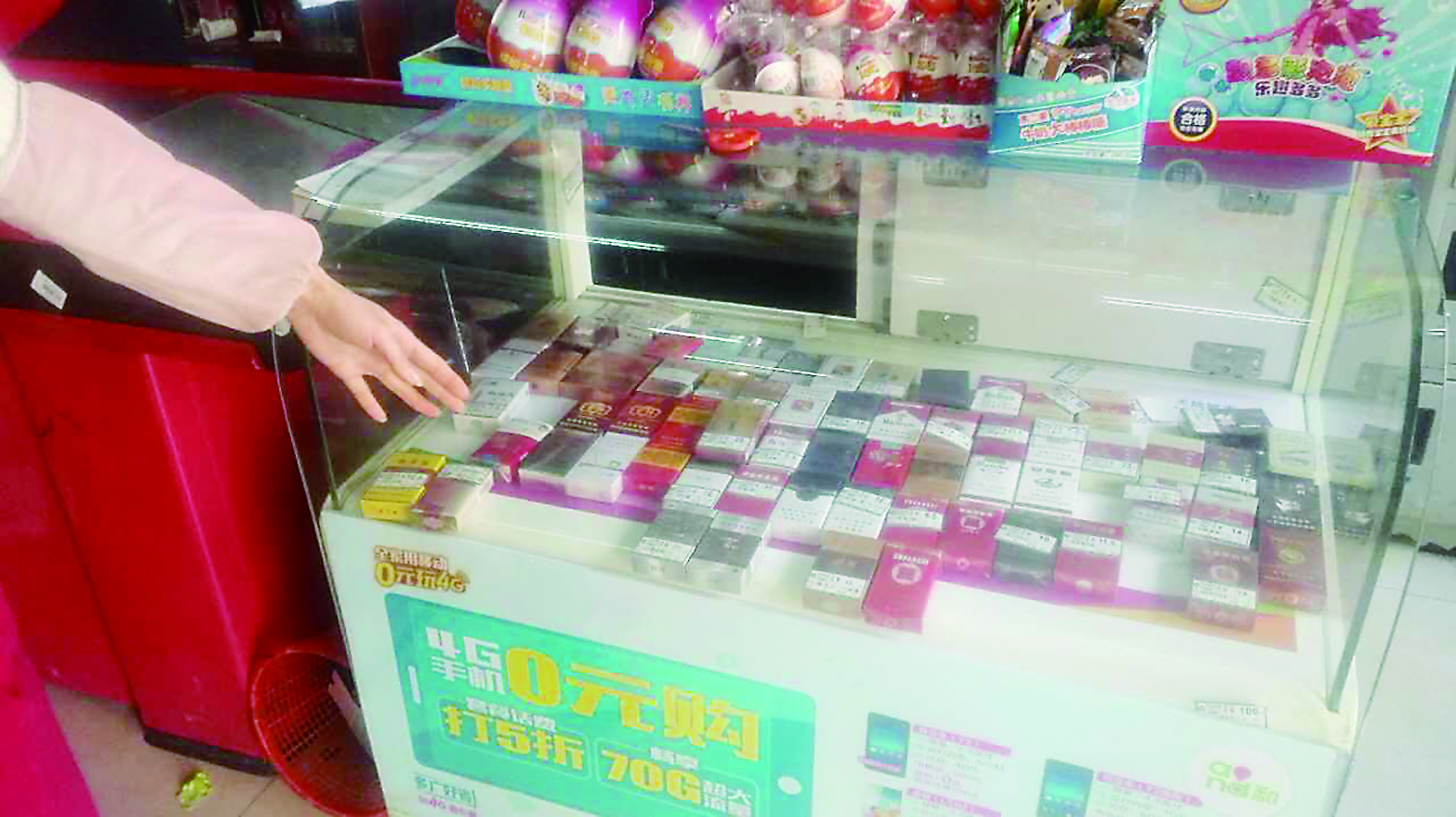 ▲柜台里的高档香烟被小偷偷走,只剩下普通香烟 记者 姚时美 摄