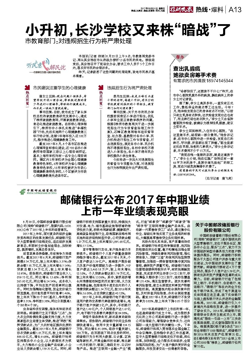 邮储银行公布2017年中期业绩 上市一年业绩表现亮眼