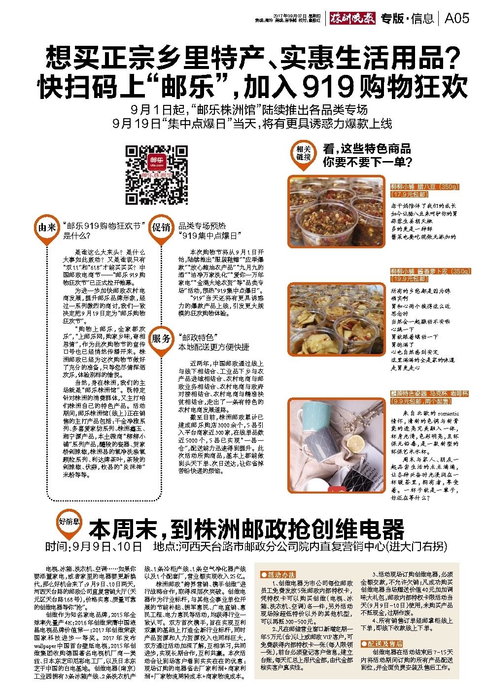 想买正宗乡里特产、实惠生活用品? 快扫码上“邮乐”,加入919购物狂欢