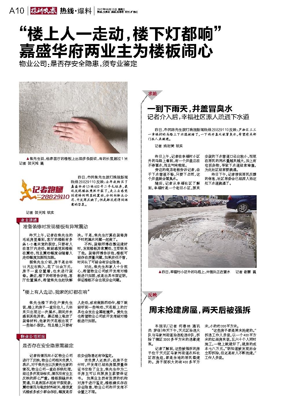 “楼上人一走动,楼下灯都响”嘉盛华府两业主为楼板闹心