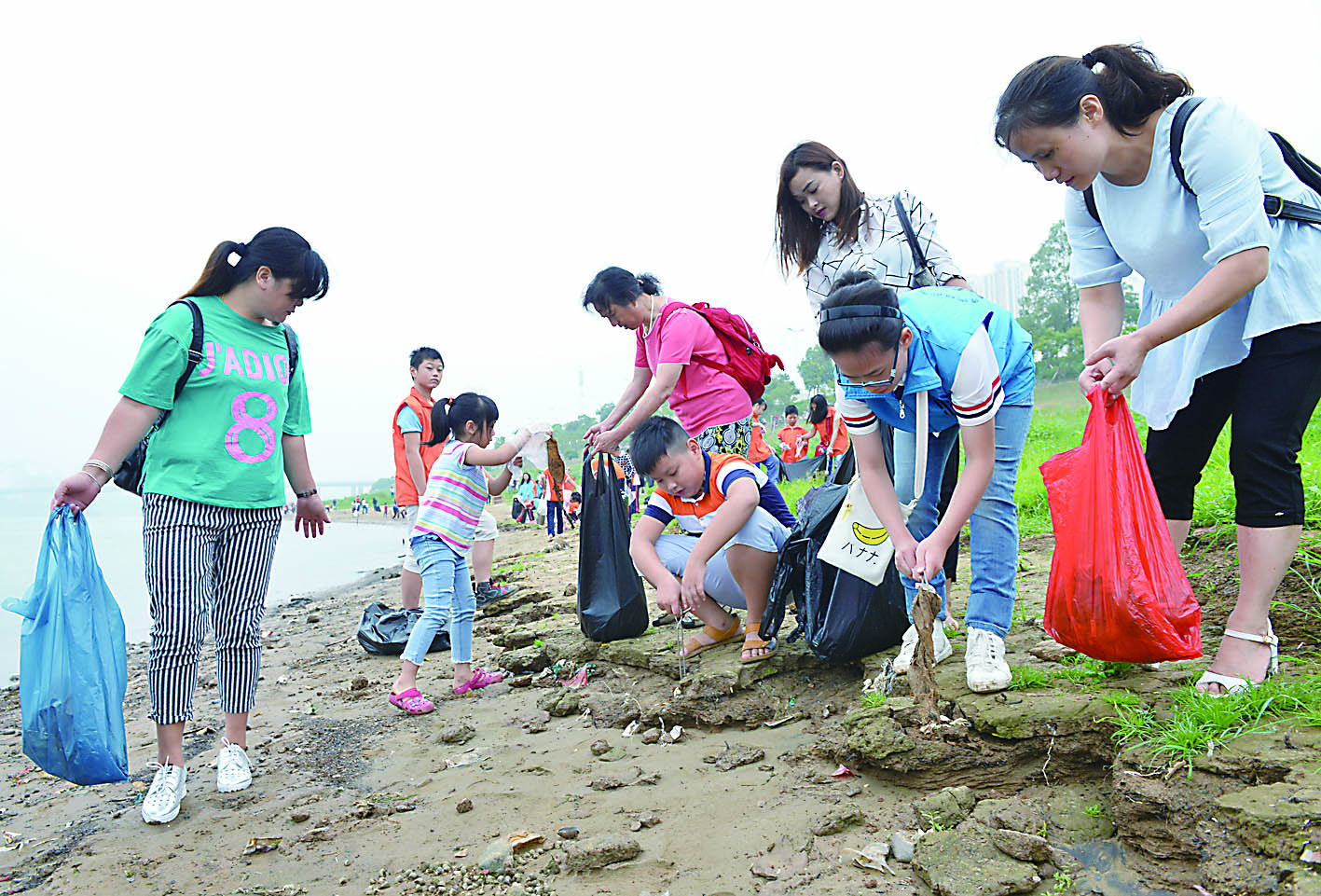 昨天上午,来自市二中附中的学生、家长和同心社工志愿者共400多人,来到河西湘江风光带五桥至体育中心段的河滩上,开展净滩行动,清理河滩上的垃圾,宣传环保。