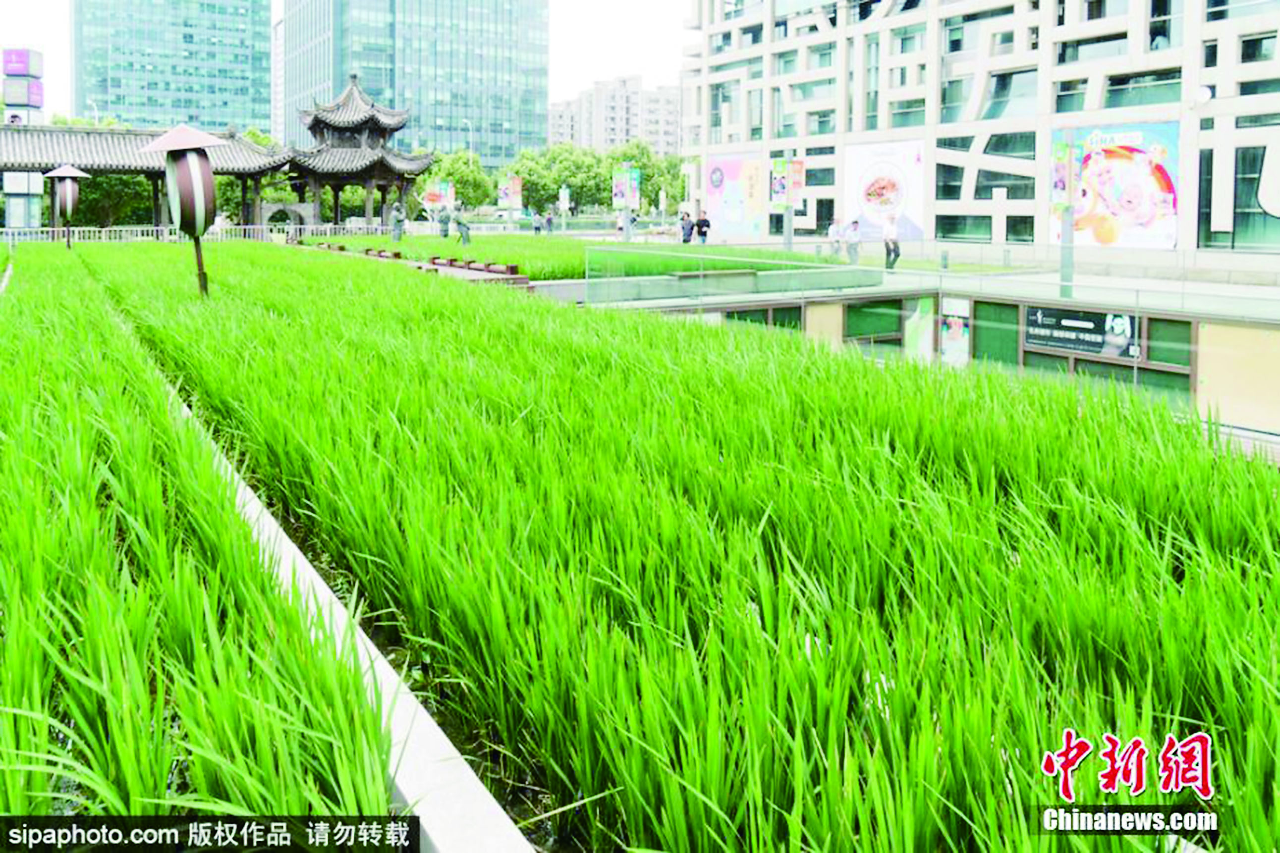 上海浦东新区芳甸路街头近日出现了成片稻田。记者8月31日在芳甸路喜马拉雅中心前的广场上看到,成片绿油油的水稻长势良好,部分水稻已经开始抽穗,预计在一两个月后即可成熟收割。据了解,这些水稻是从别处移植至此,在水稻成熟后,市民可现场参加收割水稻的活动,体验都市里的田园劳作。 (据中新社)