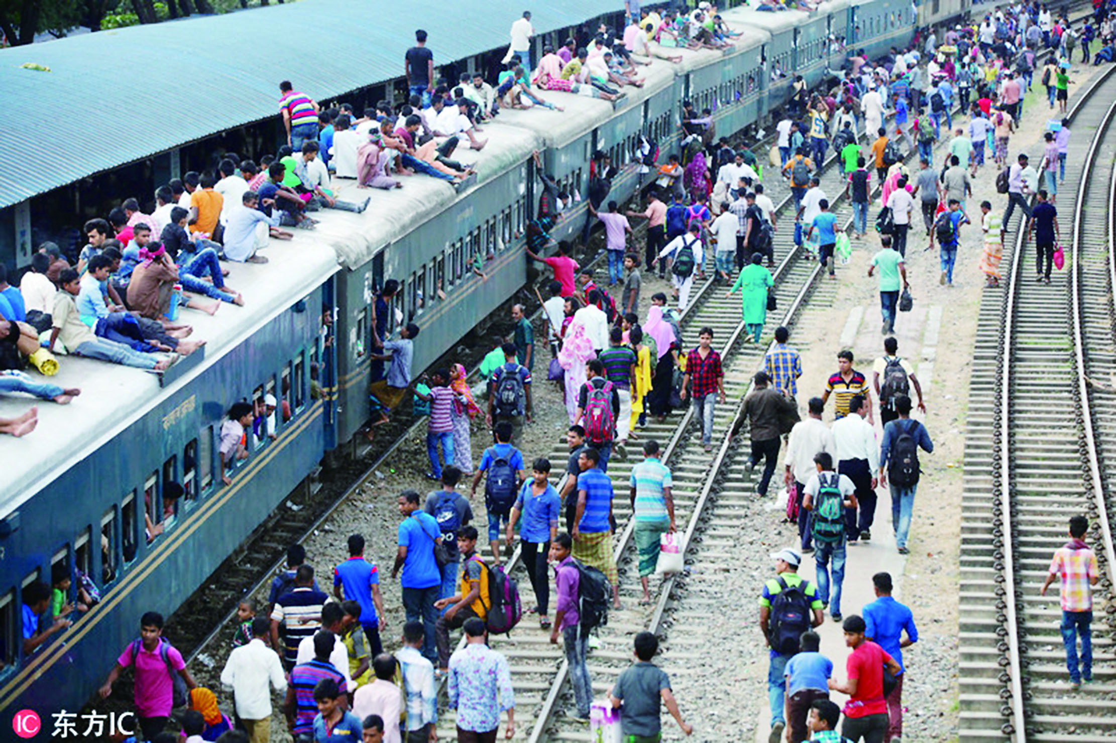 当地时间8月30日,孟加拉国达卡,返乡过宰牲节的孟加拉人从陆路、水路分别出发,甲板上人山人海,就连车顶也坐满了人。