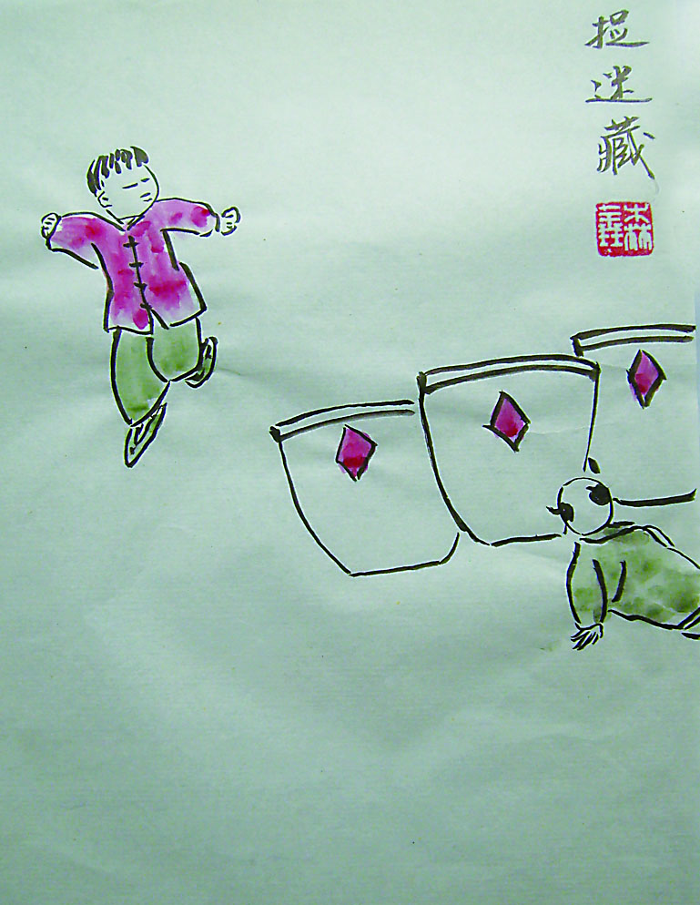 捉迷藏不但在古代的诗文中多有记载,也出现在美术作品中。清代乾隆、嘉庆时期,宫廷画师沈庆兰曾创作了一幅《婴戏图》,画中有六个孩子在玩捉迷藏的游戏,中间的一个孩子眼蒙巾帕,双臂伸长,作出抓捕的姿势,其余五个孩子,或藏之于树根,或攀假山,或躲在捉者的身后,洋溢着一派天真烂漫的童趣。这也可证明,在当时,捉迷藏的游戏已经十分普及和流行了。