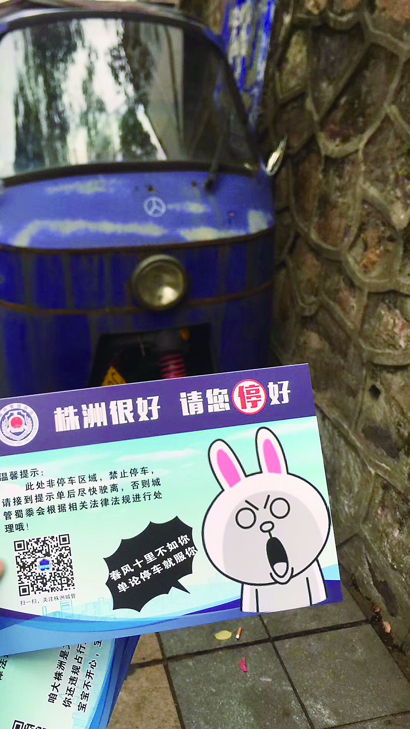 ▲昨天,市城管局联合晚报义工走上街头,对人行道上的违停车辆发放萌版提示卡。车主收到这样的萌版“罚单”,1小时内驶离不会产生罚款