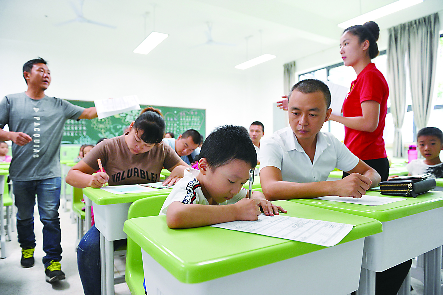▲天元区新马小学,小朋友在家长的陪伴下填写报名表 记者 谭清云 摄