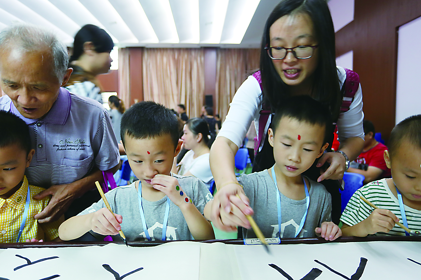 正衣冠 、行感恩礼、朱砂启智、写“人”字……体验日现场,该校参照古人“启蒙礼”形式,给一年级新生举行了“开笔礼”。现场,孩子们向家长、老师、同伴鞠躬行礼;教师则用朱砂在学子们的额头正中点上红痣,称“开天眼”,又称“朱砂启智”。