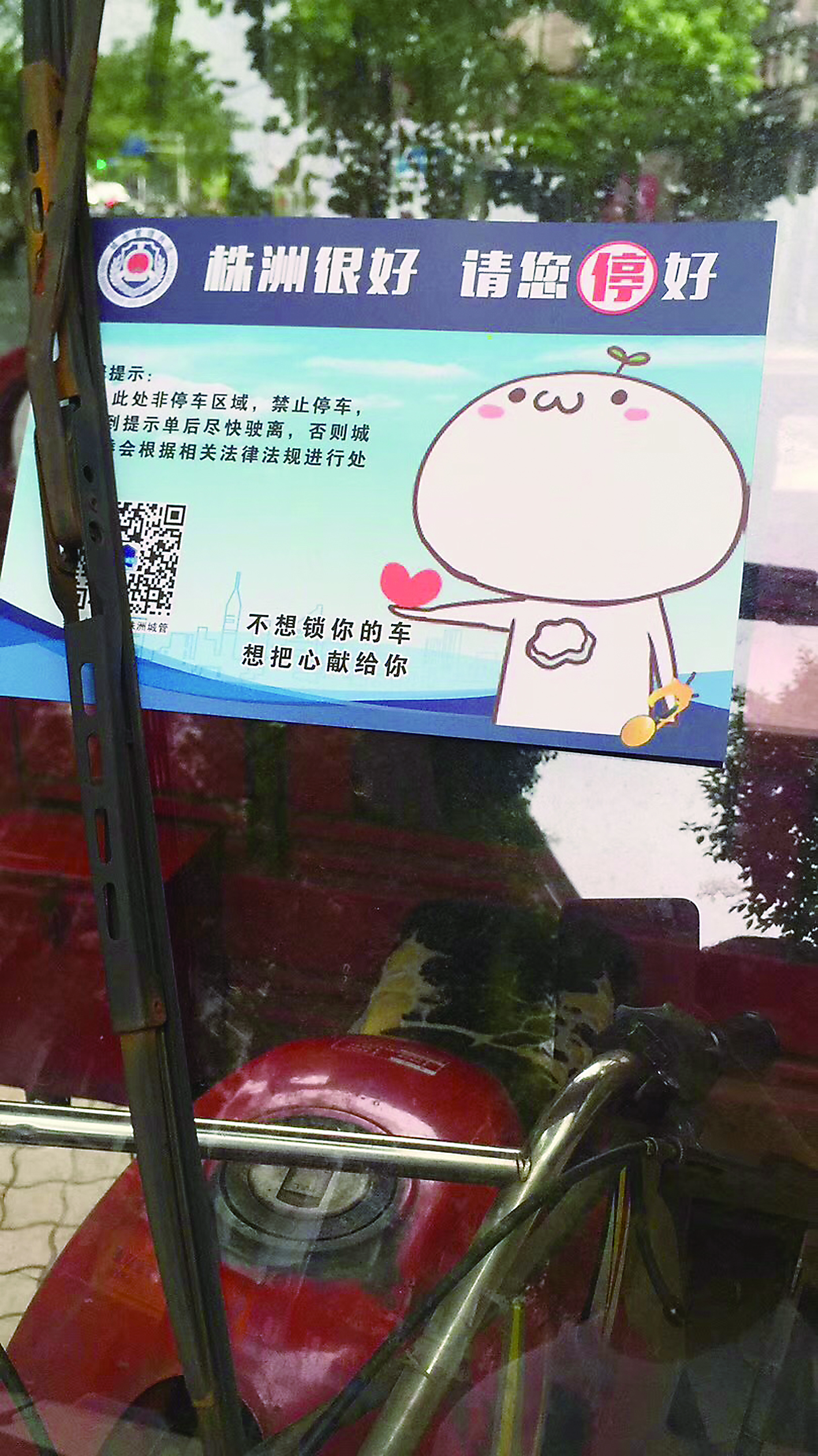 这段活泼的文字,出自市城管局设计制作的一张“表情包”温馨提示卡。提示卡共有6类,再配上“可妮兔”“布朗熊”的网络表情,让冷硬的违停警示语瞬间变得有人情味起来。昨天,市城管局联合株洲晚报义工联合会共60名志愿者走上街头,对人行道上的违停车辆发放这种提示卡。