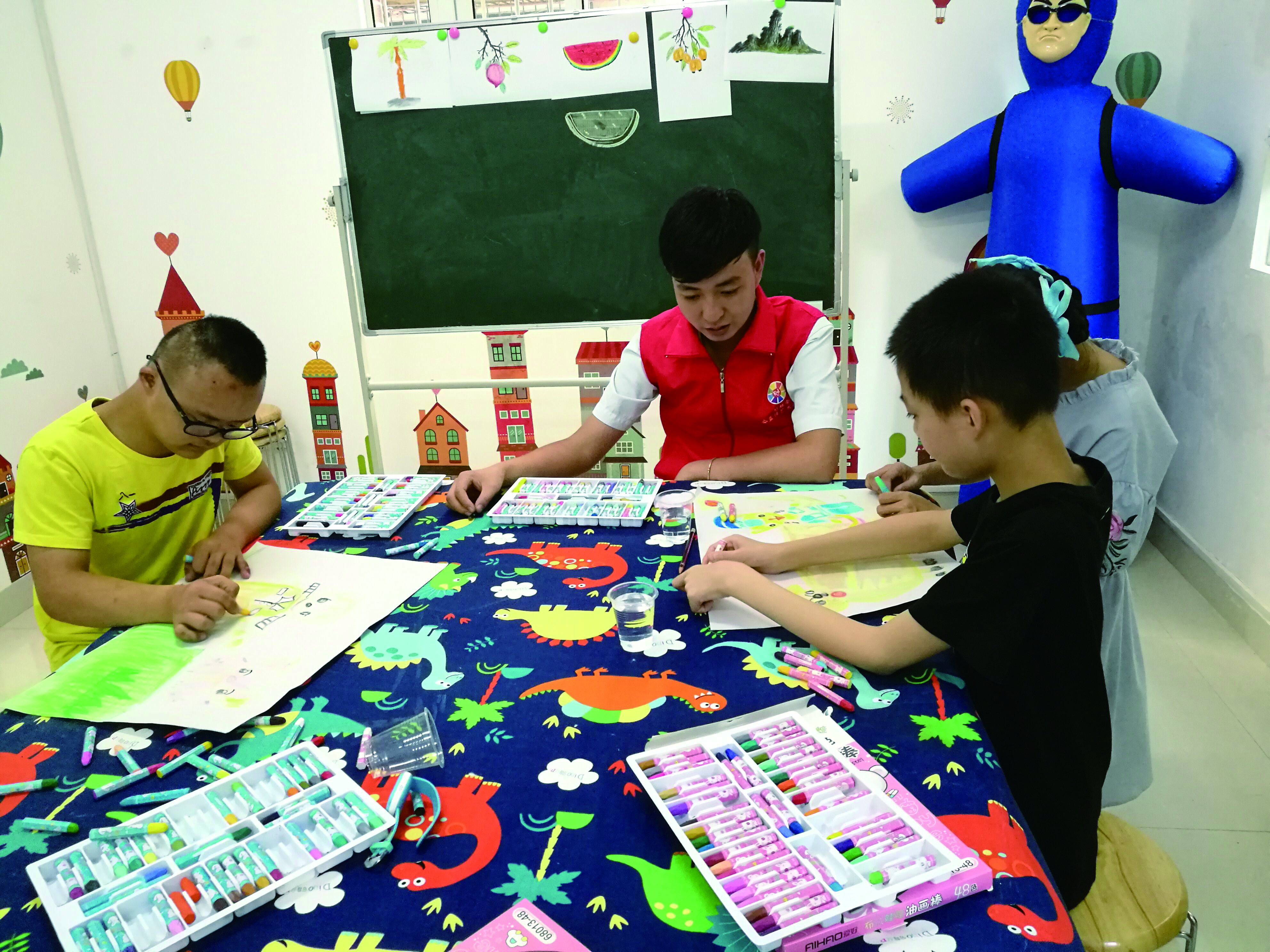通过一个多月的学习和疗愈,李荣凯欣喜地看到孩子们都有进步,教室中贴满了孩子们五彩缤纷的画作,“如今,孩子们很愿意与我们交流,课堂也充满欢笑。”