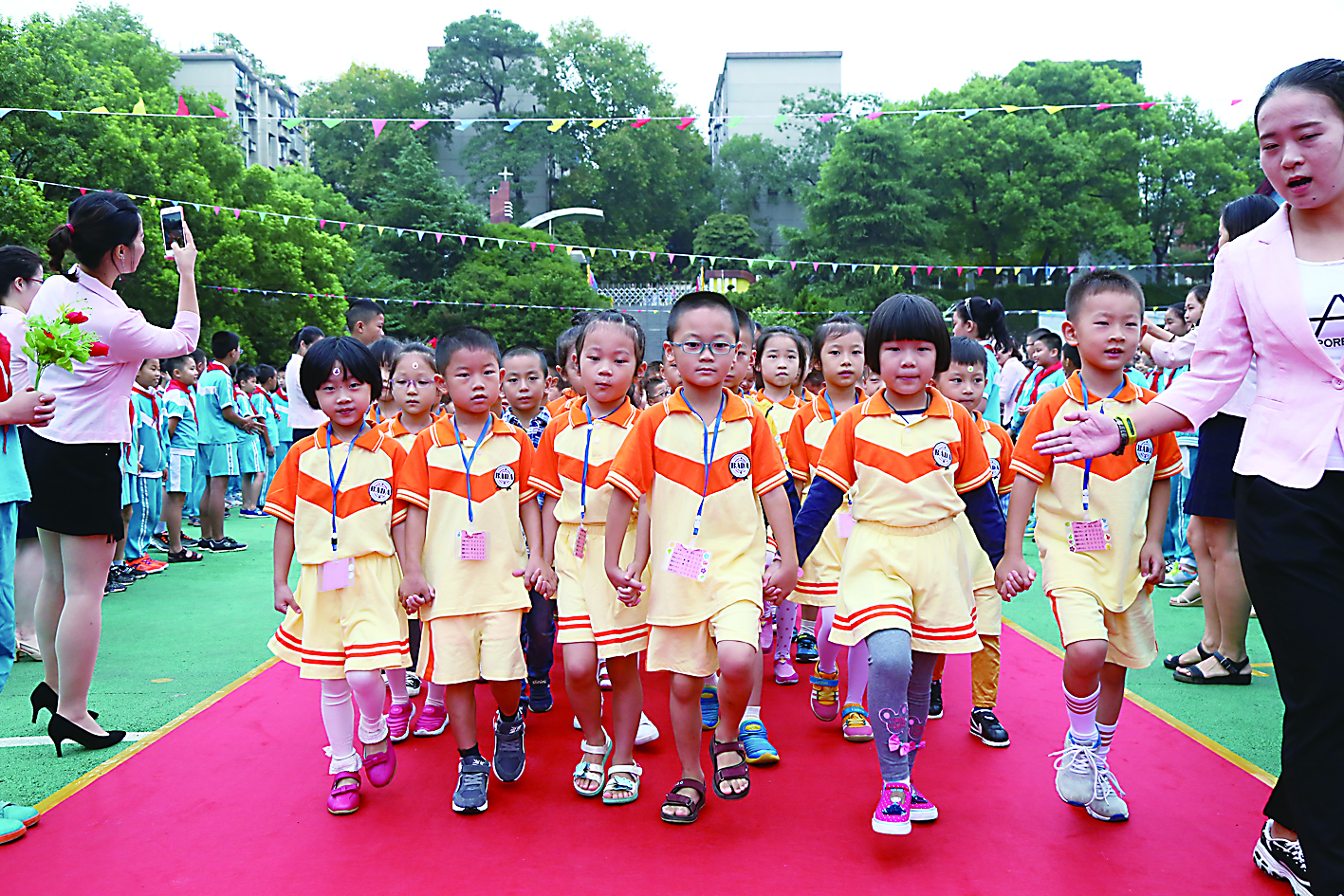 ▲开学第一天,八达小学新生和新老师齐走红地毯 通讯员 供图