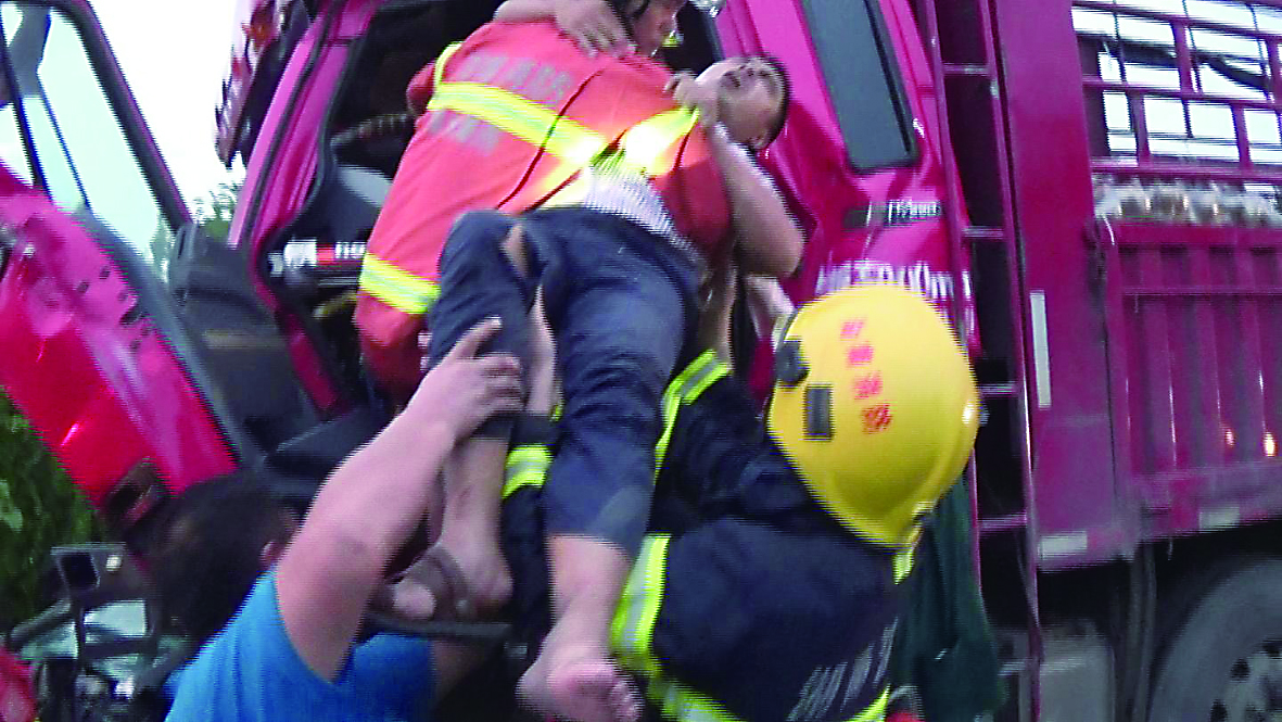 前日凌晨4时多,京港澳高速1568公里处,两辆货车发生追尾事故,后车驾驶室严重变形,一名男司机受伤被困。随后,栗雨消防中队官兵经过紧急破拆,将男司机救出。由于救援及时,伤者没有生命危险。 (记者 刘玺 通讯员 杨洋 摄影报道)