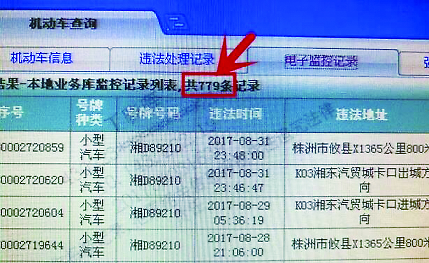 本报讯(记者 肖蓉 通讯员 彭晚华)9月3日,攸县交警大队查获了牌照为湘D89210的车子。这辆车自10年前第一次交通违法以来,就从未处理过违法记录。目前,该车已累计有779条交通违法记录,成为我市目前已查获的交通违法条数最多的车。