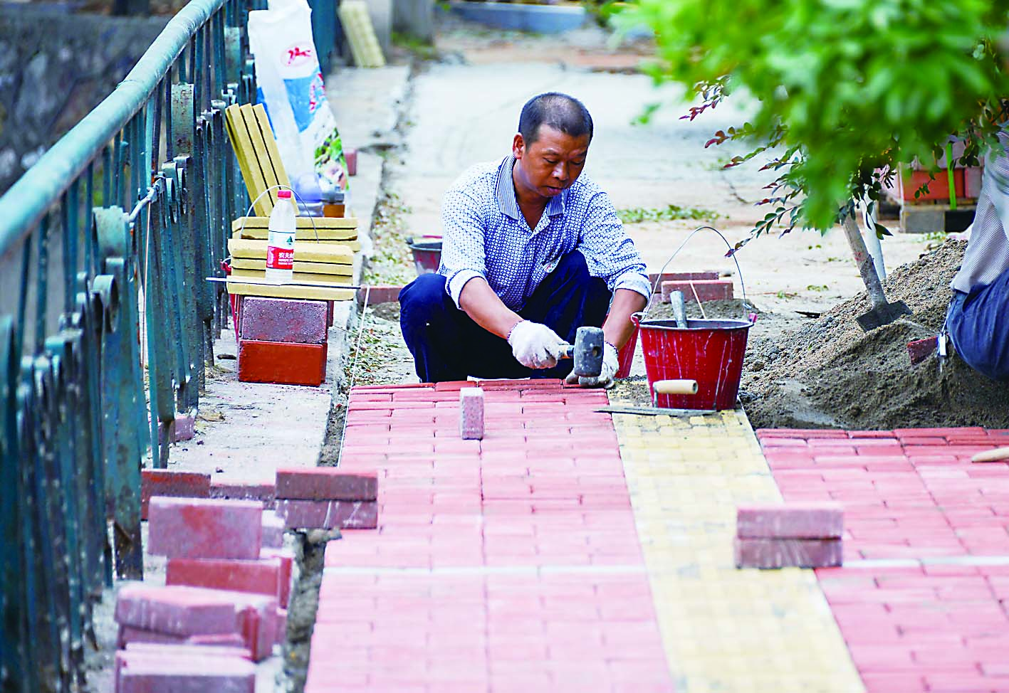 9月5日,在天元区原棉纺厂生活区,施工人员正在进行人行道铺装施工,目前居民区6至10栋路段已具备通车条件,沿线两边人行道的透水砖进行同步更换。改造工程从今年6月开始,预计在9月底全部完工。届时,小区居民将告别“晴天一身灰、雨天一身泥”的历史。
