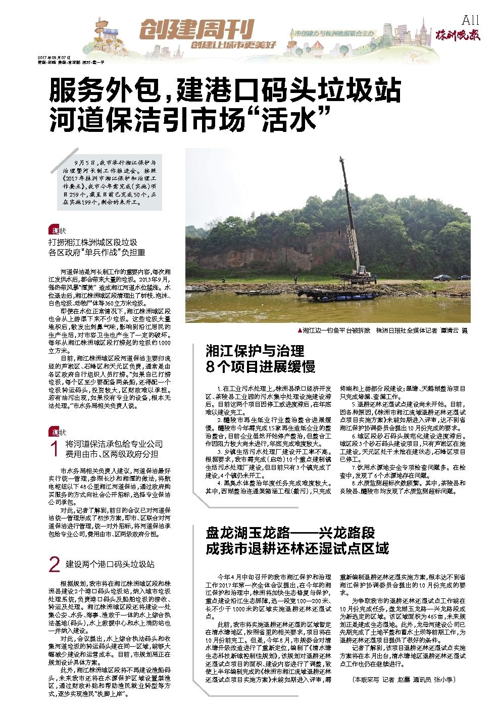 河道保洁是河长制工作的重要内容,每次湘江发洪水后,都会带来大量的垃圾。2013年9月,强热带风暴“潭美” 造成湘江河道水位猛涨。水位退去后,湘江株洲城区段清理出了树枝、泡沫、白色垃圾、动物尸体等360立方米垃圾。