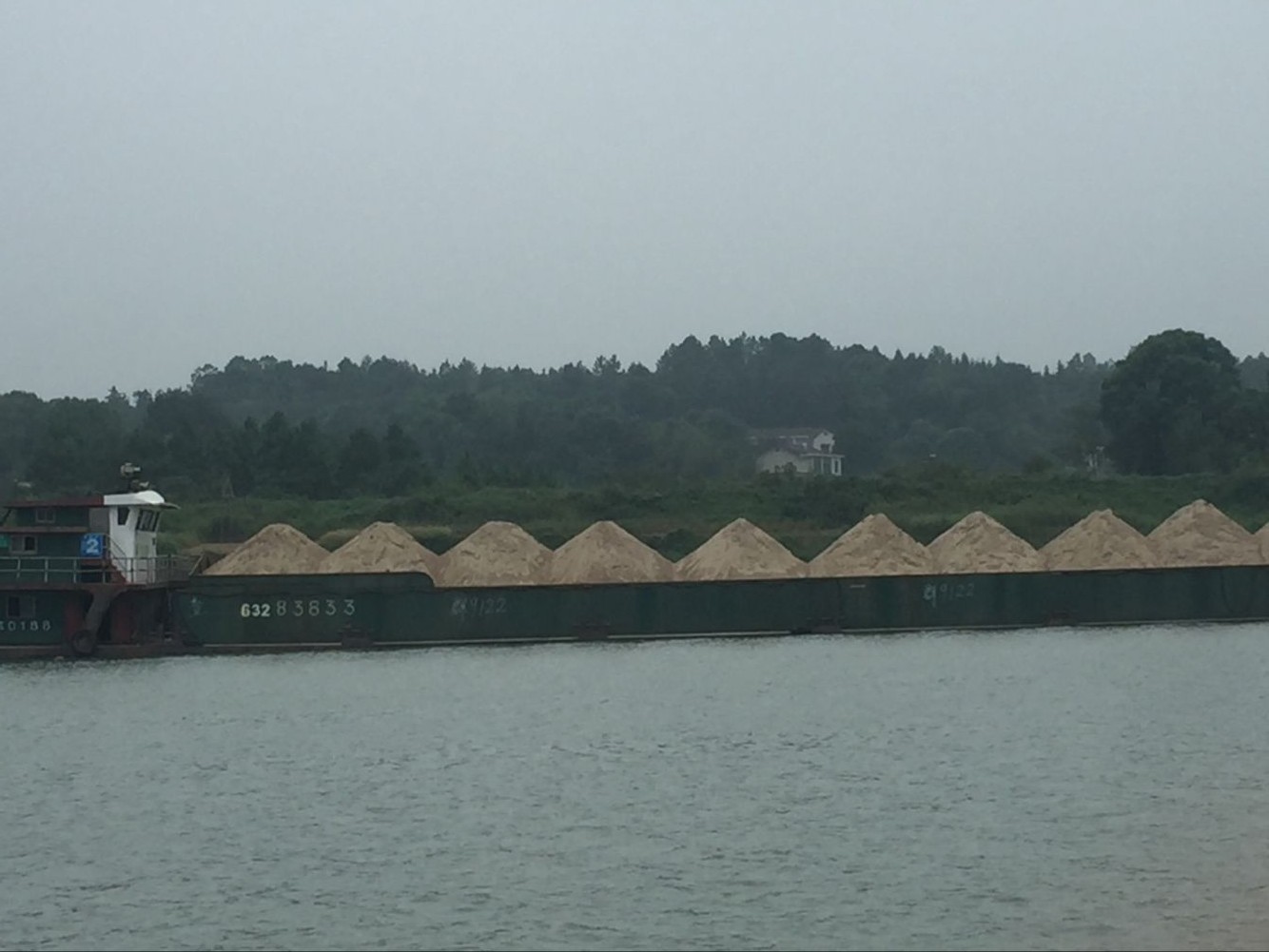 ▲挽洲岛地处株洲县、湘潭县、衡东县交界处,非法采砂者为逃避监管在此聚集。图为一艘满载沙子的运砂船从挽洲岛驶过 记者 赵露 摄