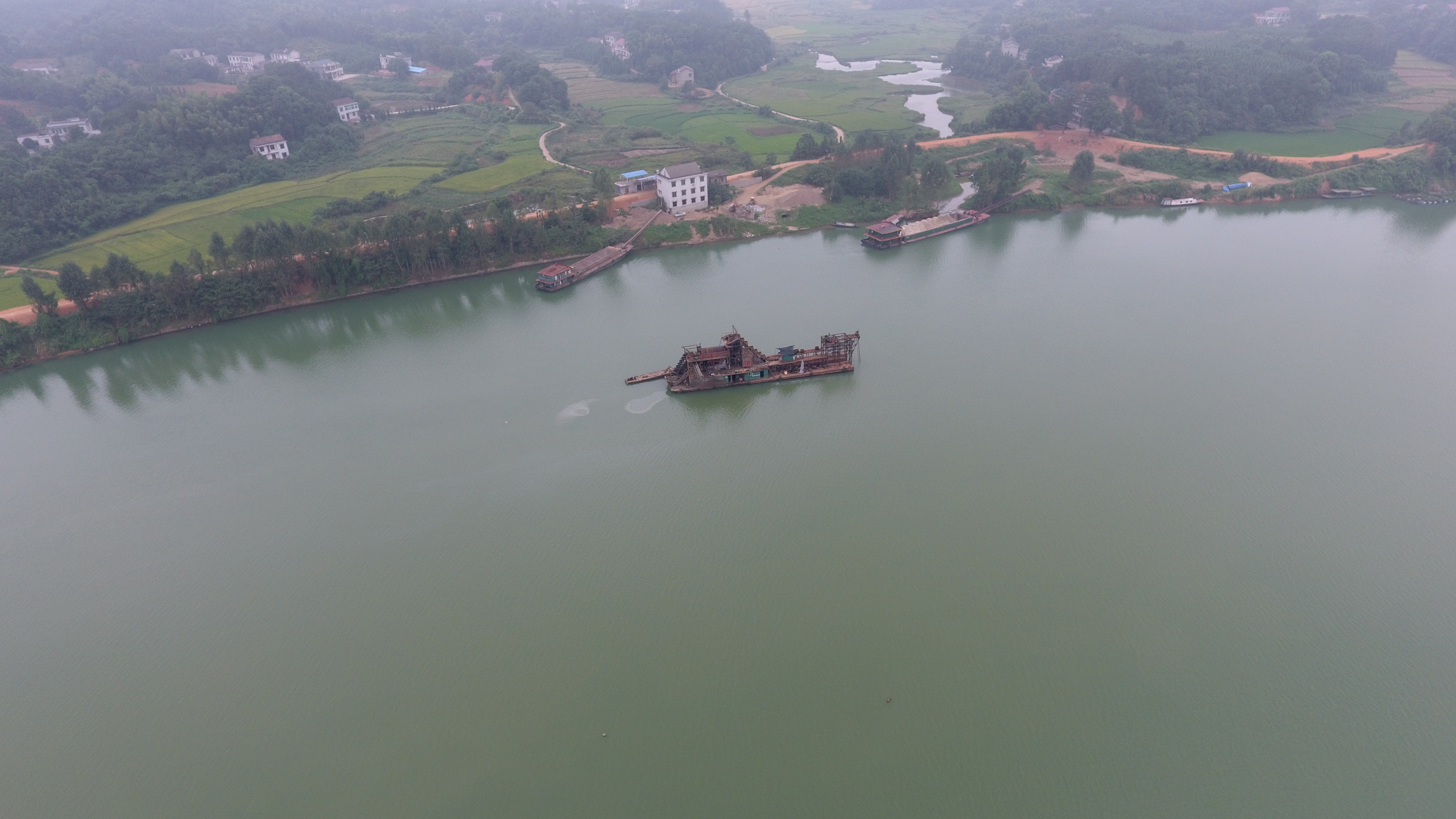 ▲从挽洲岛上空俯瞰,对岸就是在作业的采砂船和砂场 记者 赵露 摄