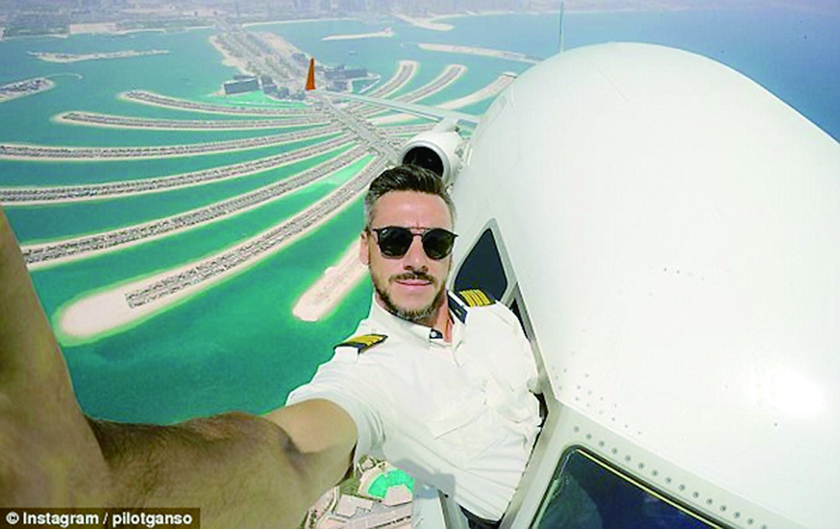 该飞行员分享的照片显示是在迪拜棕榈岛上空,他在飞行途中把半个身子露在机舱外自拍。对飞行稍有了解的网友立马分辨出照片是假的,并称航空公司是不允许这样做的;有的网友通过仔细观察,分析出阴影的方向及机翼的颜色不对;有的网友则质问他为何要做如此危险的动作,这会危及全飞机的乘客……而最出卖这张照片真实性的当属飞行员太阳镜里反射出的机场跑道了。
