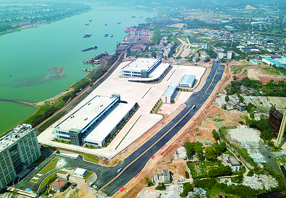9月8日,在铜塘湾保税物流园(B型)项目旁,疏港大道K0+540-近江路段完成沥青中面层施工,具备通车条件。疏港大道为城市主干道,设计时速60km/h,东起旗芸路,西至近江路,全长1.3km,双向六车道。该项目概算总投资3.2亿元,是我市2017年重点项目,预计2018年建成,届时将改善区域路网条件。 记者 刘震 摄