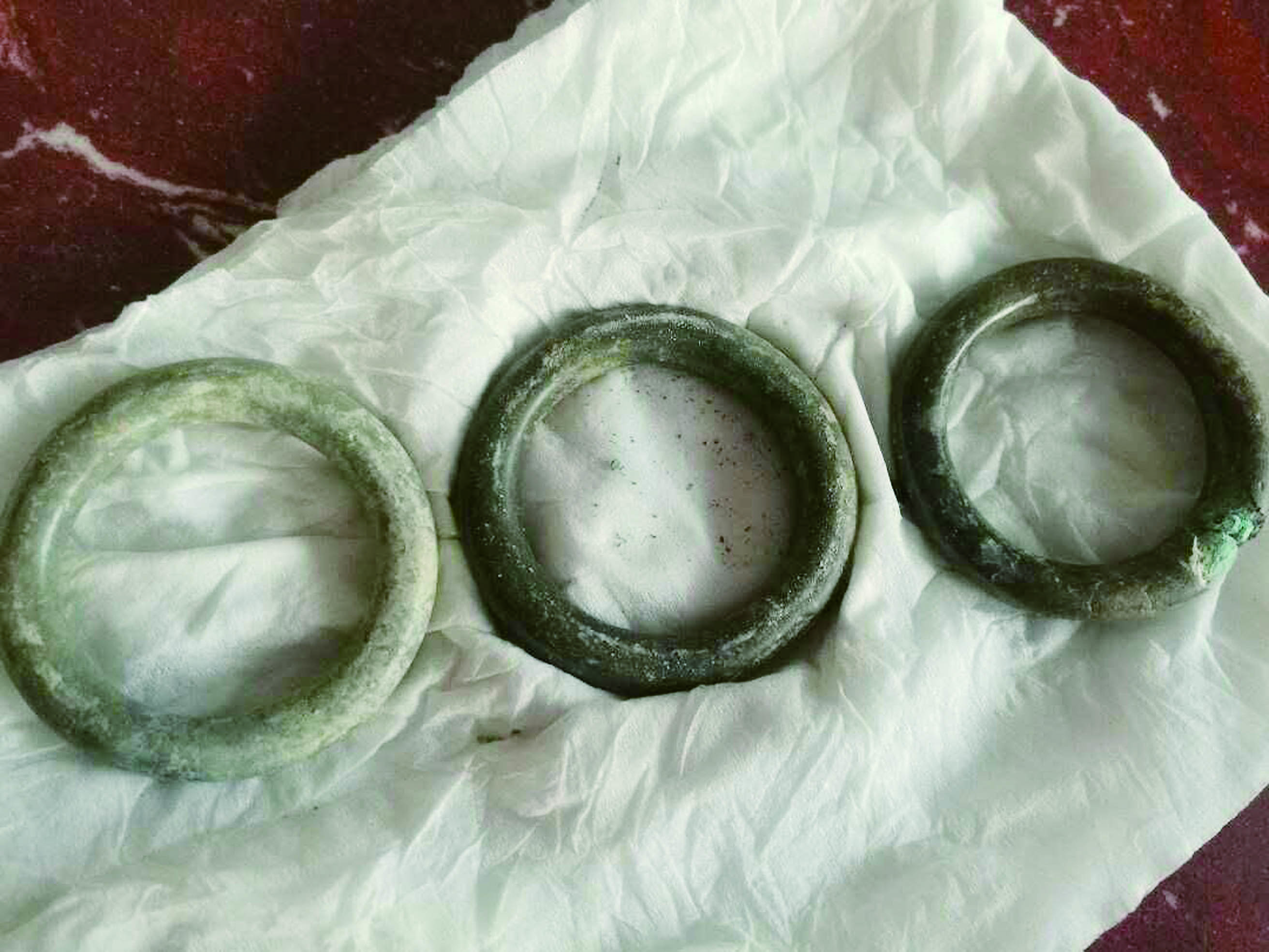本案中,警方追缴的文物包括3件青铜圆环(大的青铜器上的装饰件,例如青铜壶耳)以及一些纹饰非常精美的青铜器残片,应该是青铜容器损坏造成的。