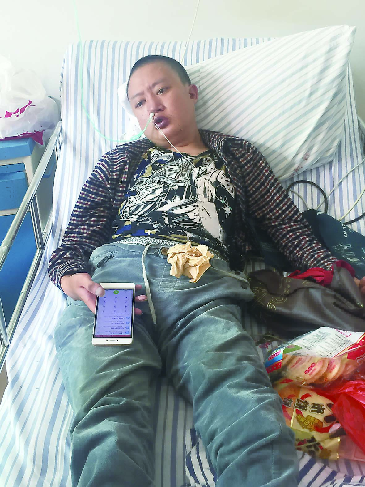 ▲躺在病床上的杨胜情绪很低落