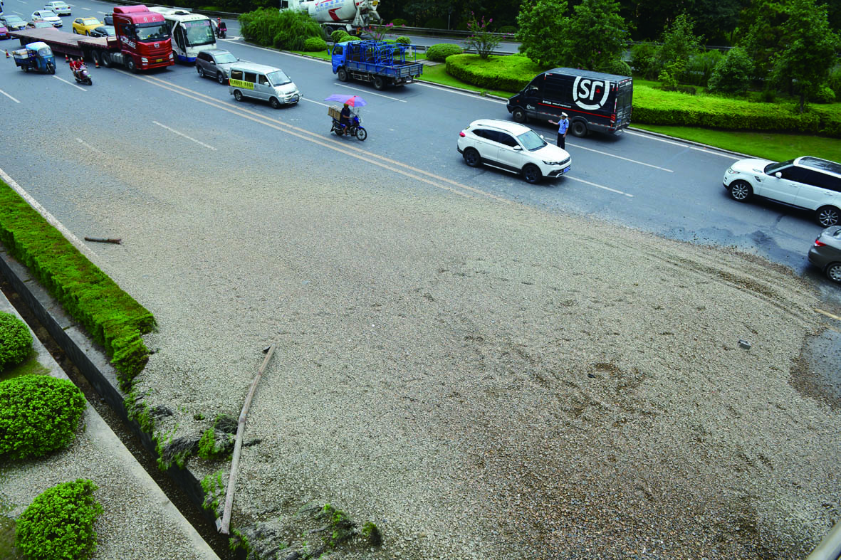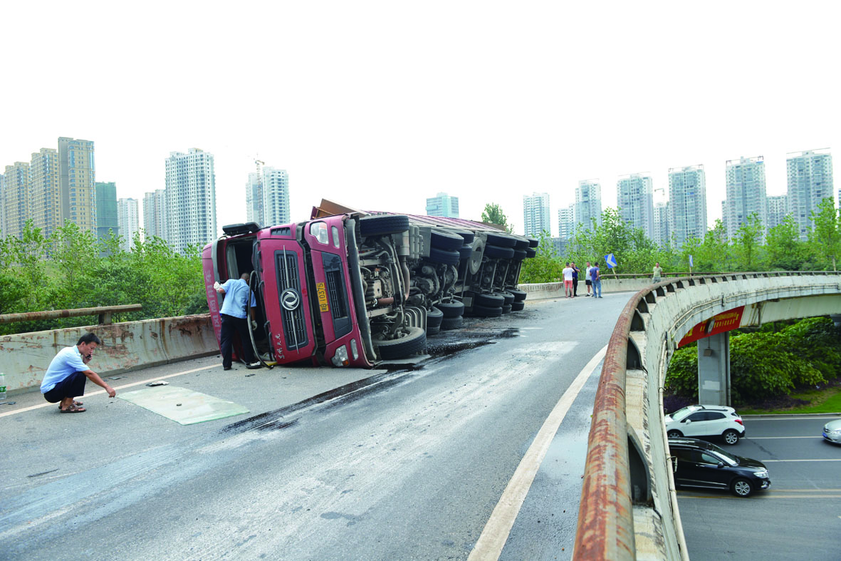 ▲货车在东湖立交上侧翻,所运砂石倾泻在桥下的株洲大道上 记者 谢慧 摄